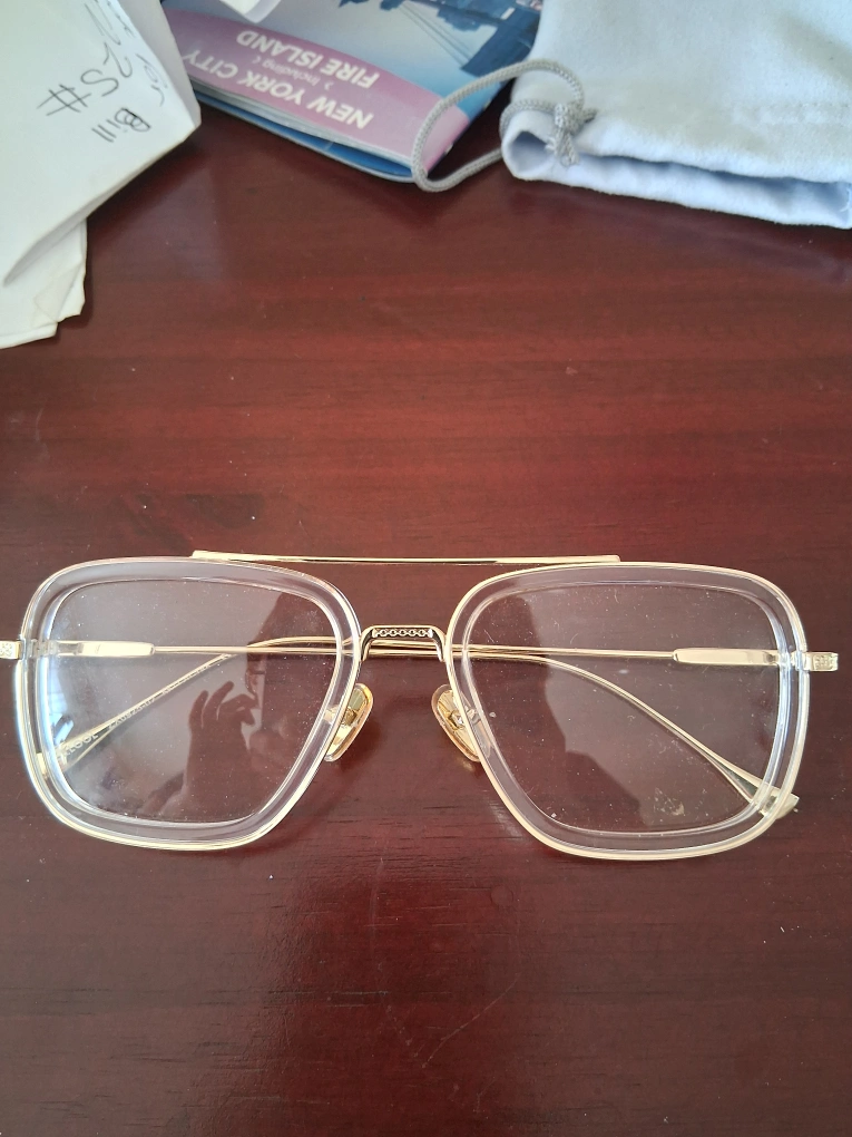 70Selling these stylish sunglasses with a clear frame and gold metal accents! They're in great shape and ready for a new owner. Comes with a soft pouch for storage