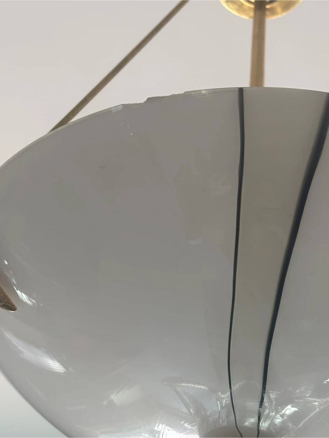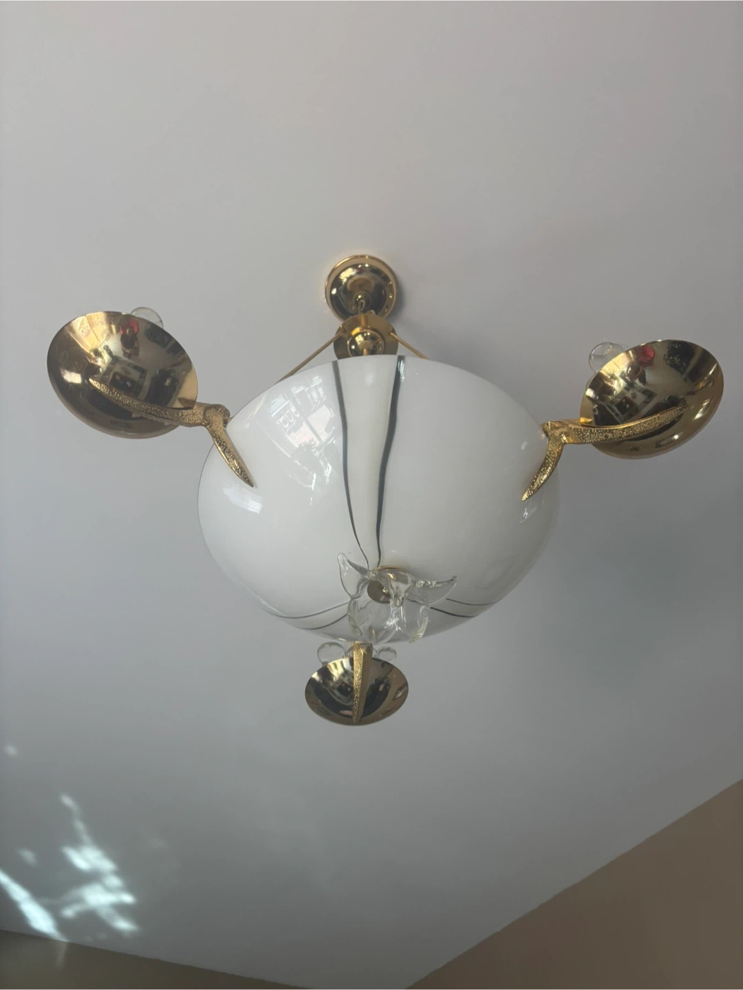Selling a decorative ceiling light with gold pleated and white accents. It has a unique design that could add a touch of elegance to any room. There is a small crack on the light. Had it for years and never got black because it’s plated and gold. It’s not brass.
