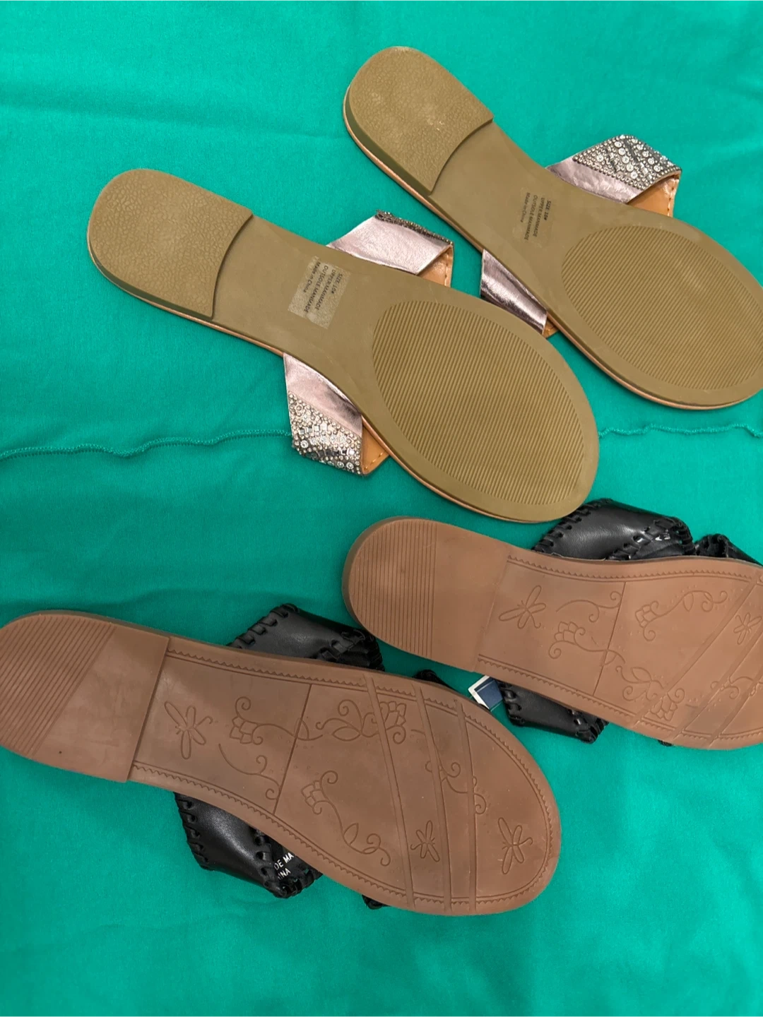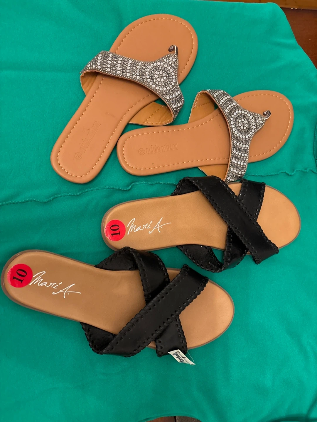 91Two pairs of sandals for sale! Olivia miller and features a sparkly design. The other pair is by Mari A. and has a black criss-cross strap. Both are a size 10 and in great condition NEW Both $15