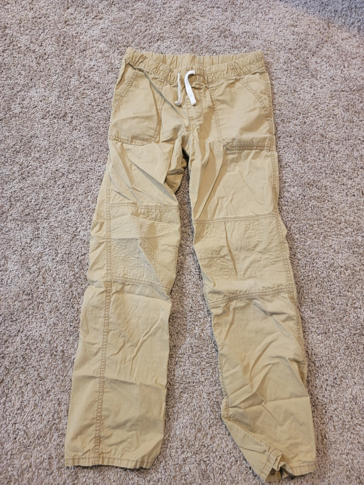 These are a pair of khaki-colored utility pants. They feature a drawstring waist and multiple pockets. Great for everyday wear! size 12-14 boys