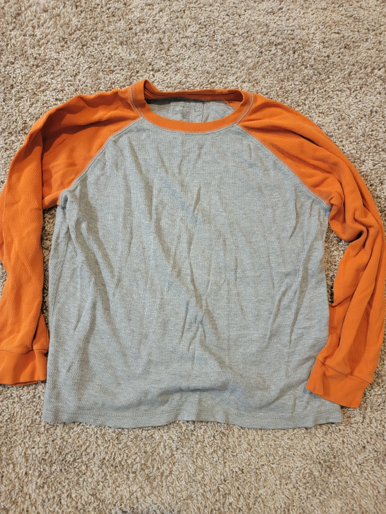 Selling a boys' long sleeve raglan shirt in size 10/12. It features orange sleeves and a gray body. Perfect for casual wear!
