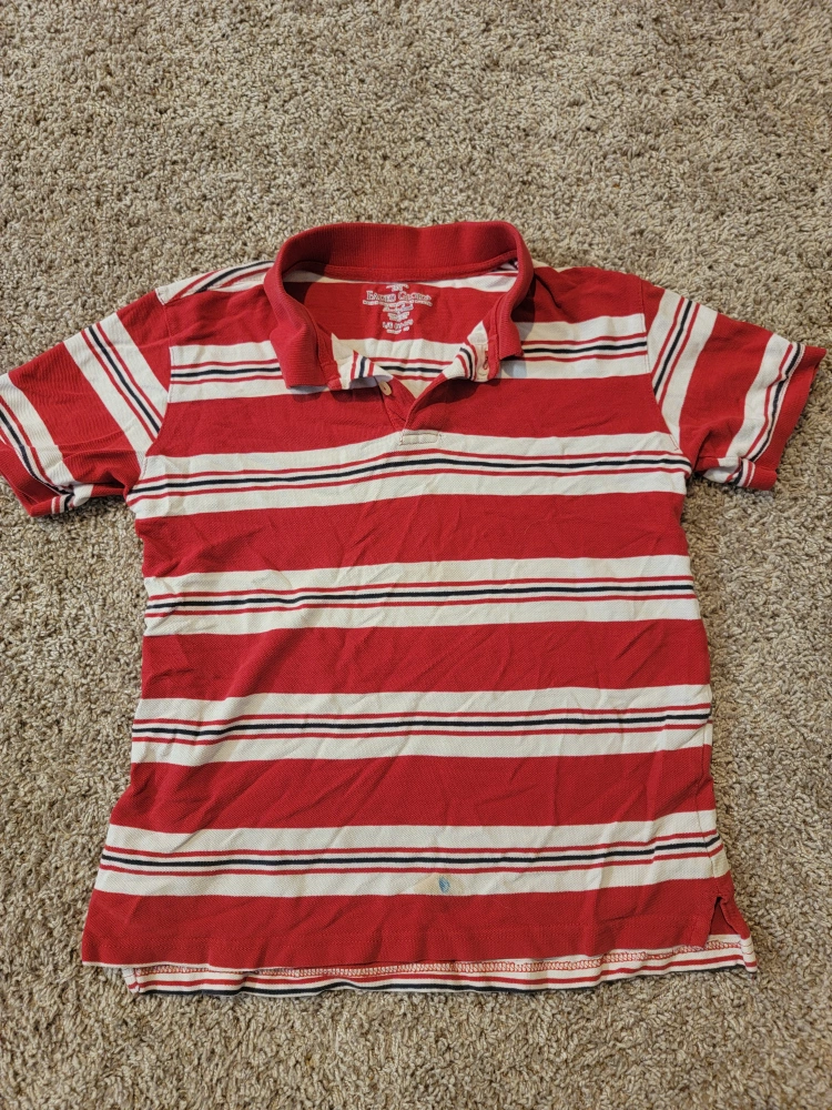 Selling a Basic Editions polo shirt. The shirt is red with white and navy stripes. It's a size large and there is a stain at the bottom. it was a favorite of my boys'