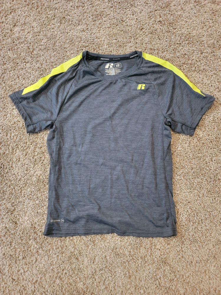 Selling a gray Russell Athletic t-shirt in size large. It features yellow accents on the shoulders and is made with dri-power 360 fabric. Great for workouts or casual wear! size 10-12 boys