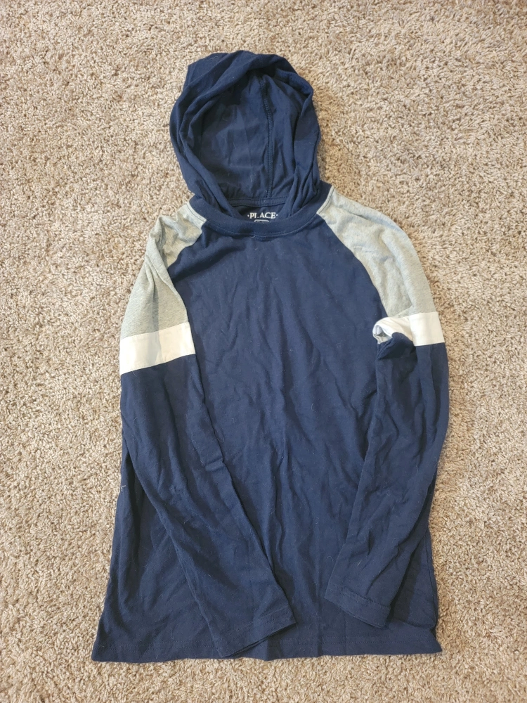 Selling a hoodie from The Children's Place. It's a navy blue color with gray and white sleeves. It's in good condition and ready for a new home! size 10-12