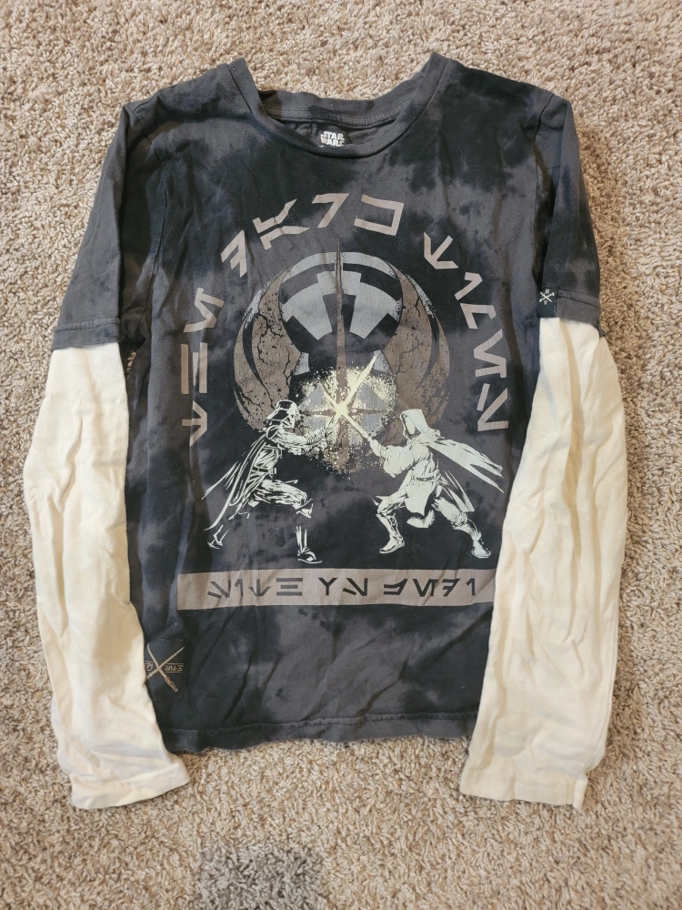 Selling a Star Wars long sleeve shirt with a cool design! It features Darth Vader and Obi-Wan Kenobi engaged in a lightsaber duel. The shirt has a gray tie-dye body and cream-colored sleeves. Perfect for any young Star Wars fan! size 10-12