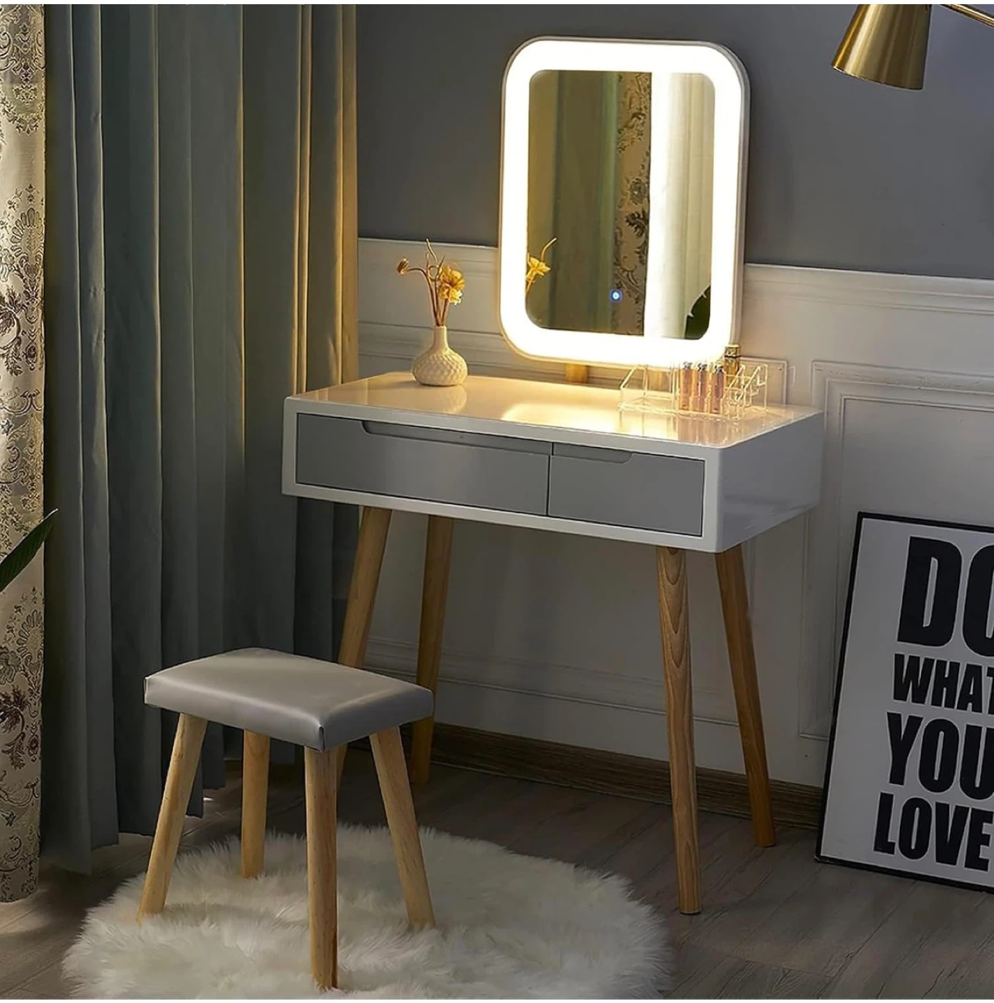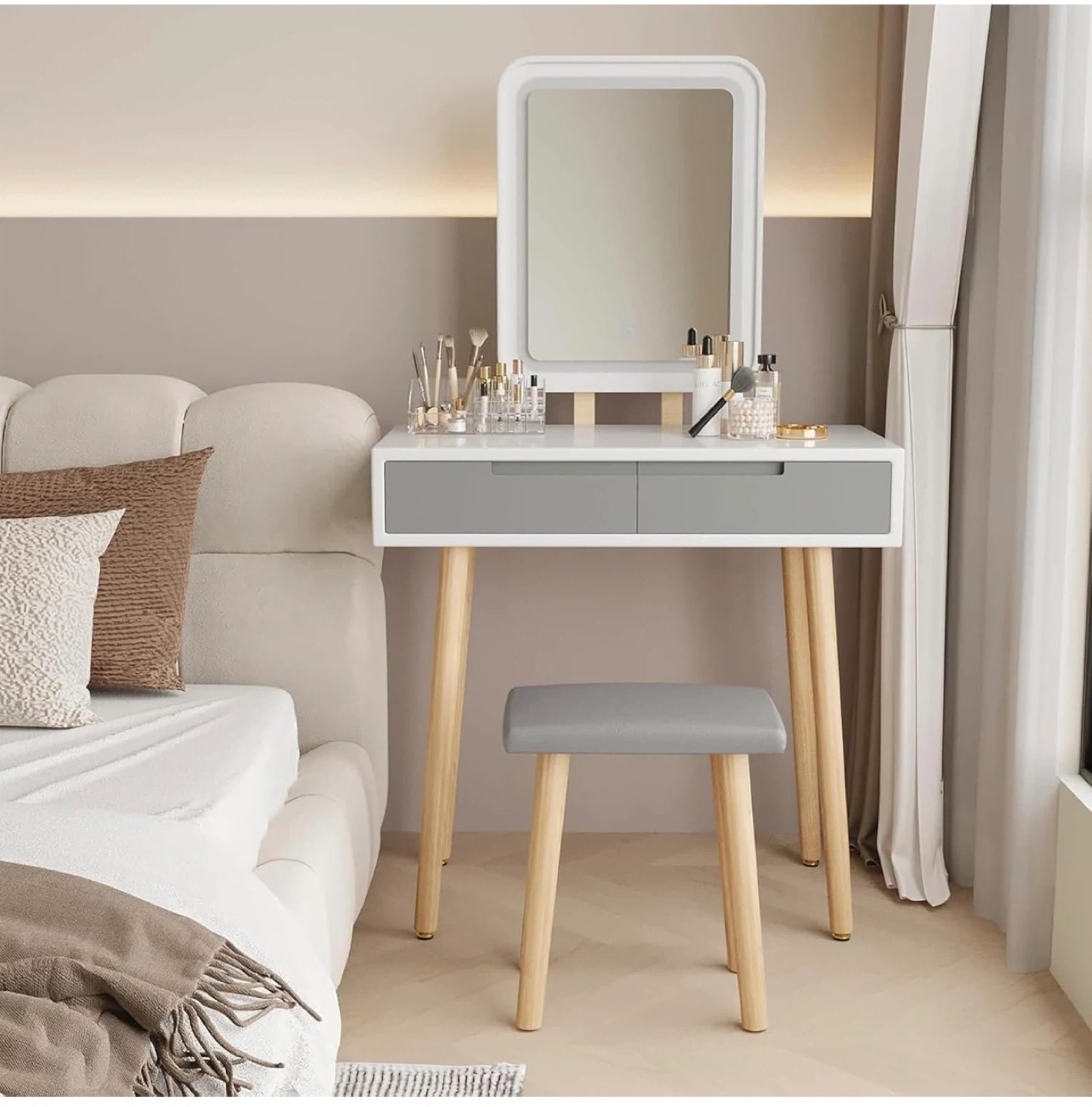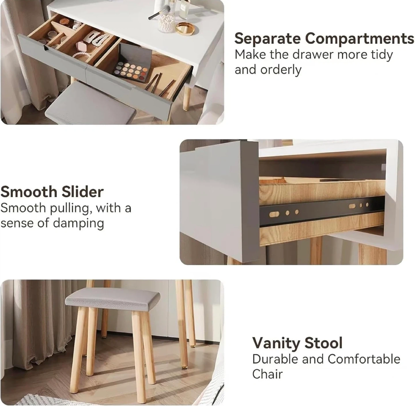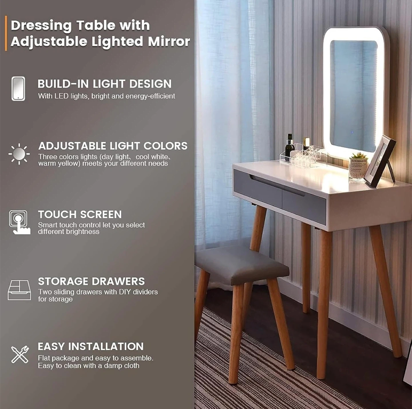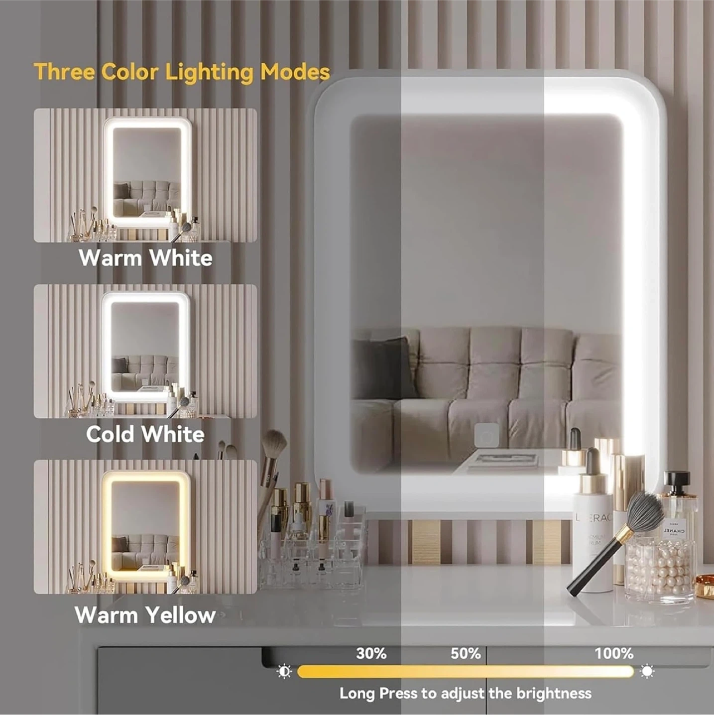 10This vanity table comes with an adjustable lighted mirror, offering three color lighting modes: warm white, cold white, and warm yellow. The brightness is adjustable via a touch screen. It also features storage drawers with DIY dividers and a comfortable vanity stool. The design includes a smooth slider for the drawers, ensuring a smooth pulling experience.