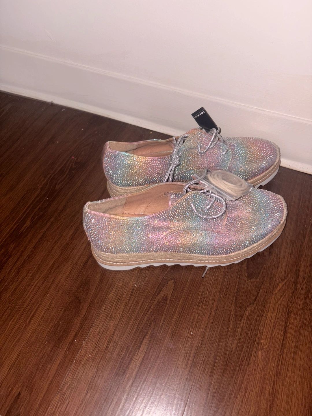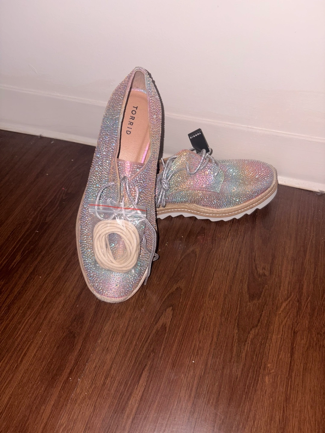 Selling a pair of Torrid embellished espadrille shoes in a size 13 woman new They have a beautiful, iridescent sparkle! These are perfect for adding a touch of glam to any outfit. They come with extra laces