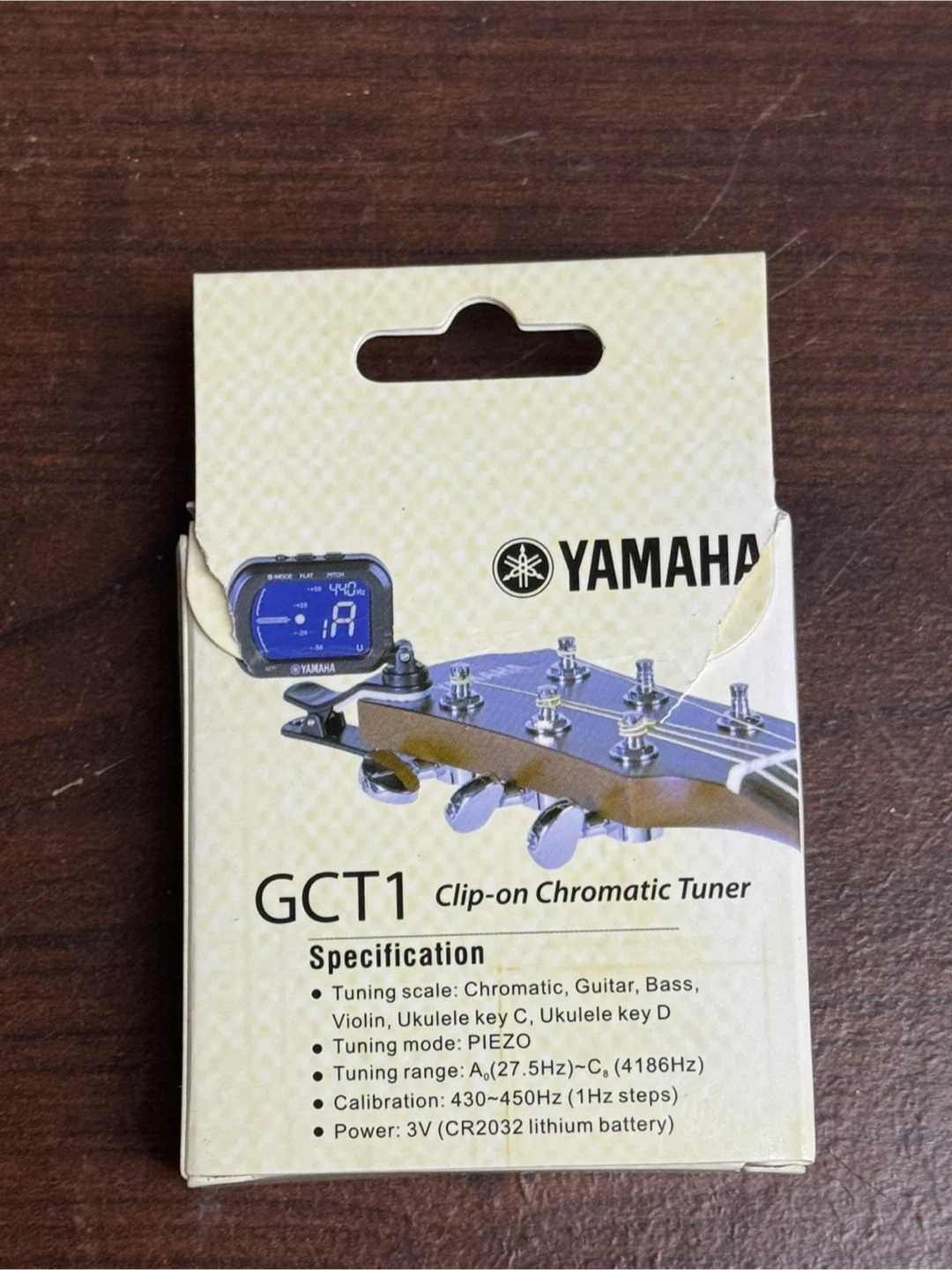 89Selling a Yamaha GCT1 clip-on chromatic tuner! It's perfect for tuning your guitar, bass, violin, or ukulele. Specification: - Tuning scale: Chromatic, Guitar, Bass, Violin, Ukulele key C, Ukulele key D - Tuning mode: PIEZO - Tuning range: A₀(27.5Hz)~C₈ (4186Hz) - Calibration: 430~450Hz (1Hz steps) - Power: 3V (CR2032 lithium battery)