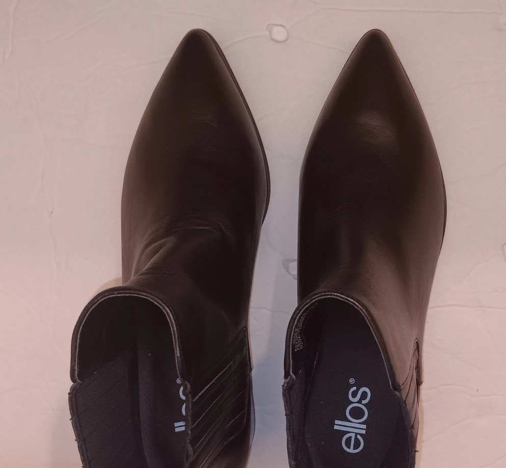 Selling a pair of Ellos black Leather booties in size 7 1/2M. These boots LEATHER and brand new! They have a classic Chelsea boot style with a sleek, pointed toe and a comfortable block heel.