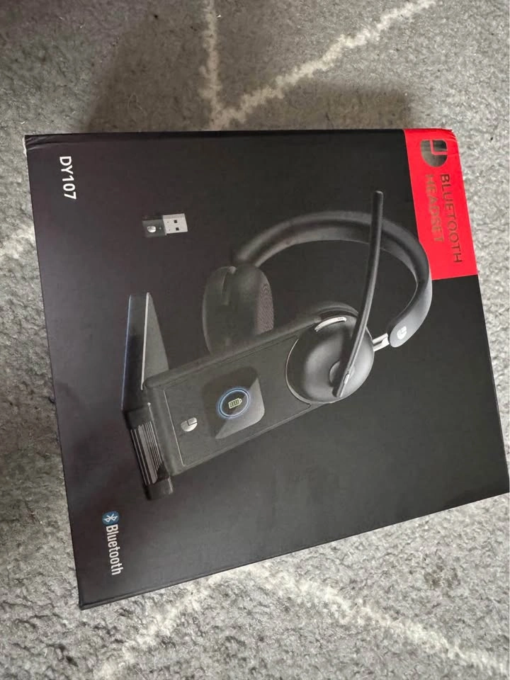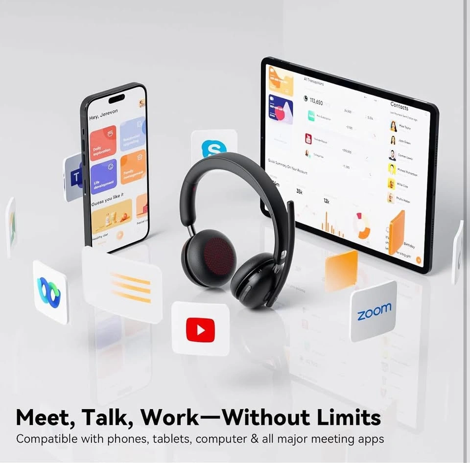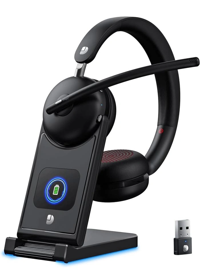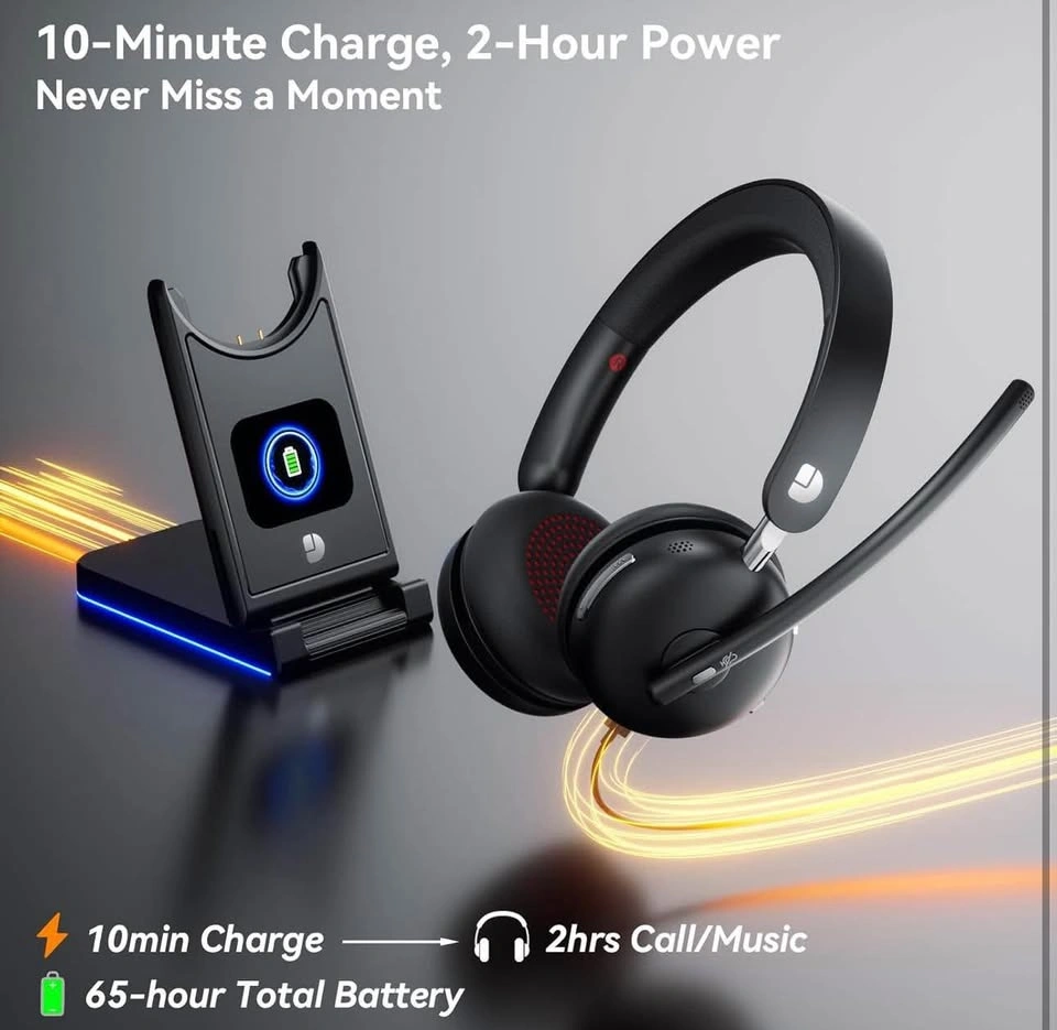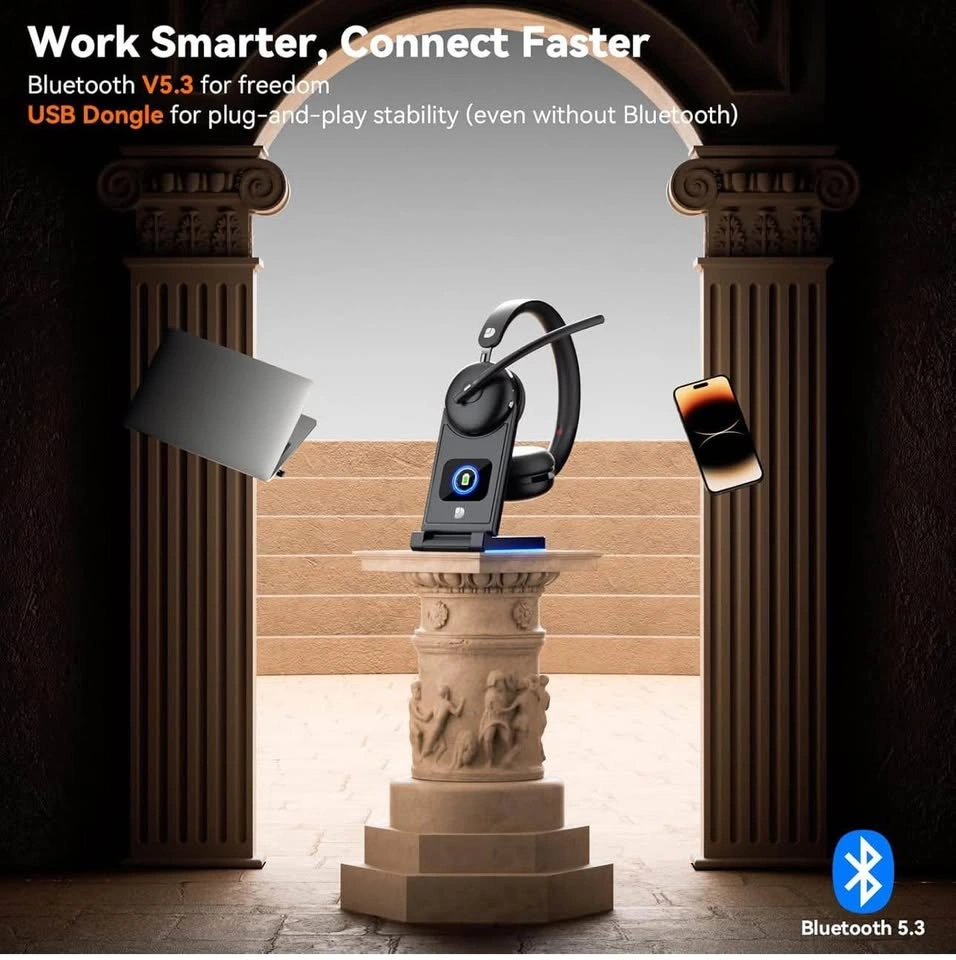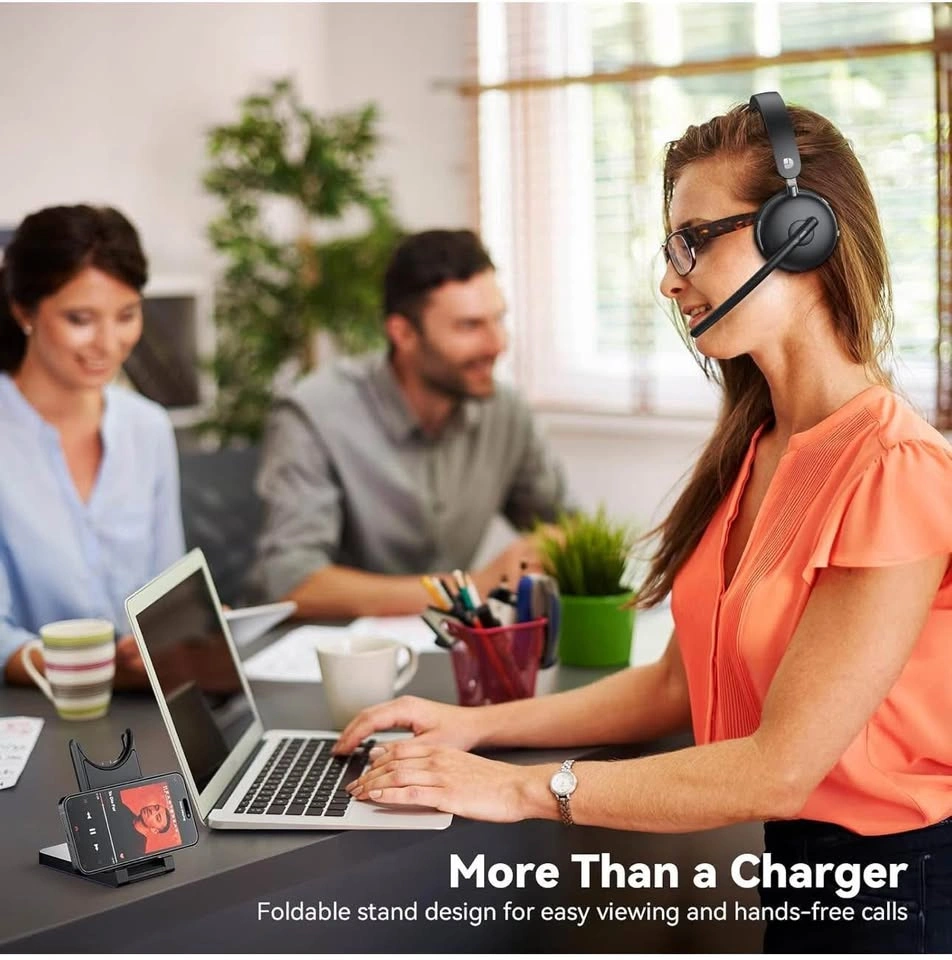 Bluetooth 5.3 Headset with Noise Cancelling, Wireless Headsets with 65Hrs Battery & 10Min Fast Charge, Smart Dock with Digital Display for PC/Computer/Teams