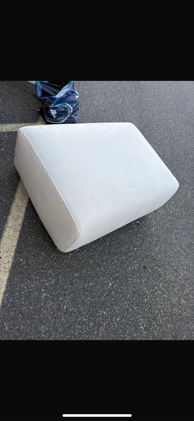 Selling a comfortable white ottoman. It's in good condition and perfect for kicking your feet up after a long day! It could be used as additional seating or as a coffee table with a tray on top