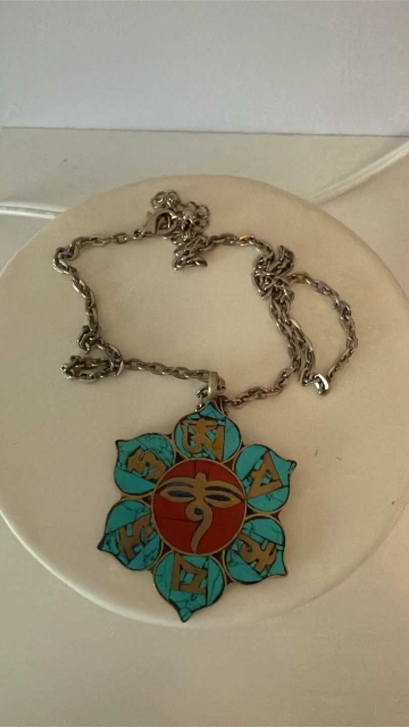 This is a beautiful turquoise flower pendant necklace. The pendant features a unique design with a red center and gold detailing. It's a stylish accessory to add a pop of color to any outfit!