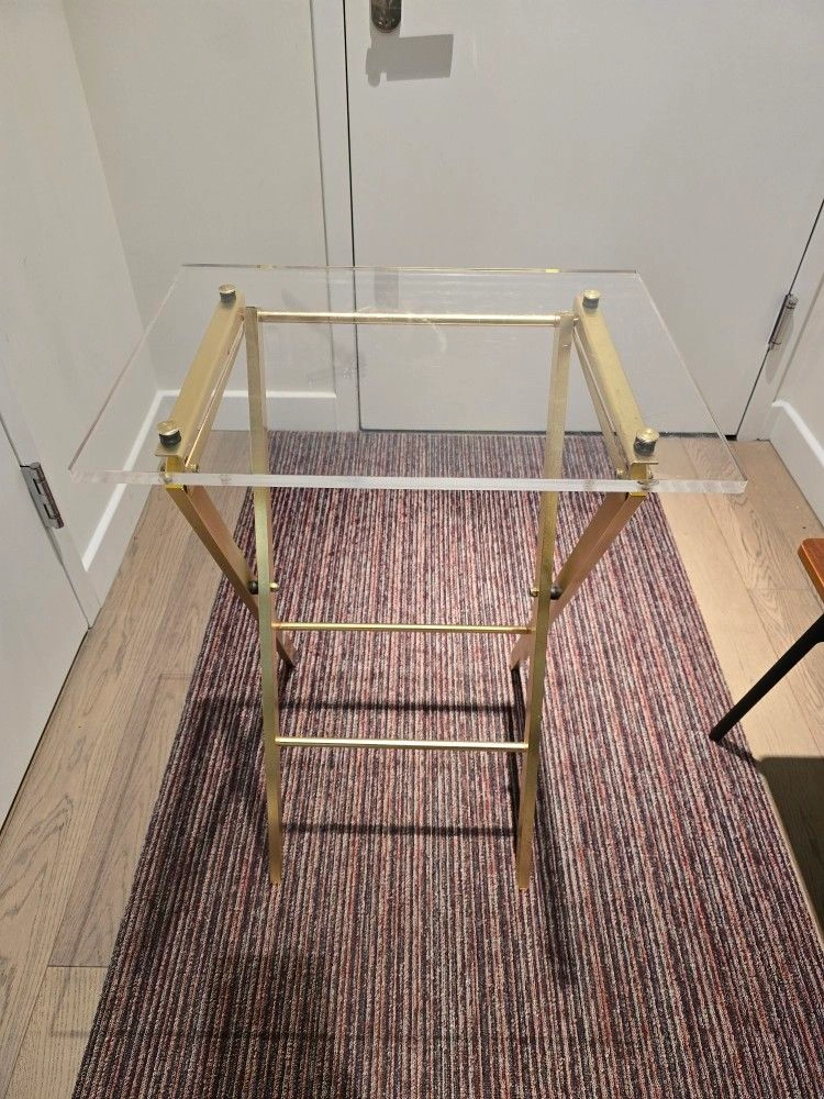 Selling a sleek CB2 Novo Acrylic Folding Table. A stylish, modern accent piece that easily folds and tucks away when not in use. It’s clear acrylic with brass finish legs, so it blends in beautifully with a range of decor styles. Gently used, very very minor surface scratches (expected for acrylic), nothing deep. No structural issues, folds cleanly, legs are stable, and from a smoke-free and pet-free home.
