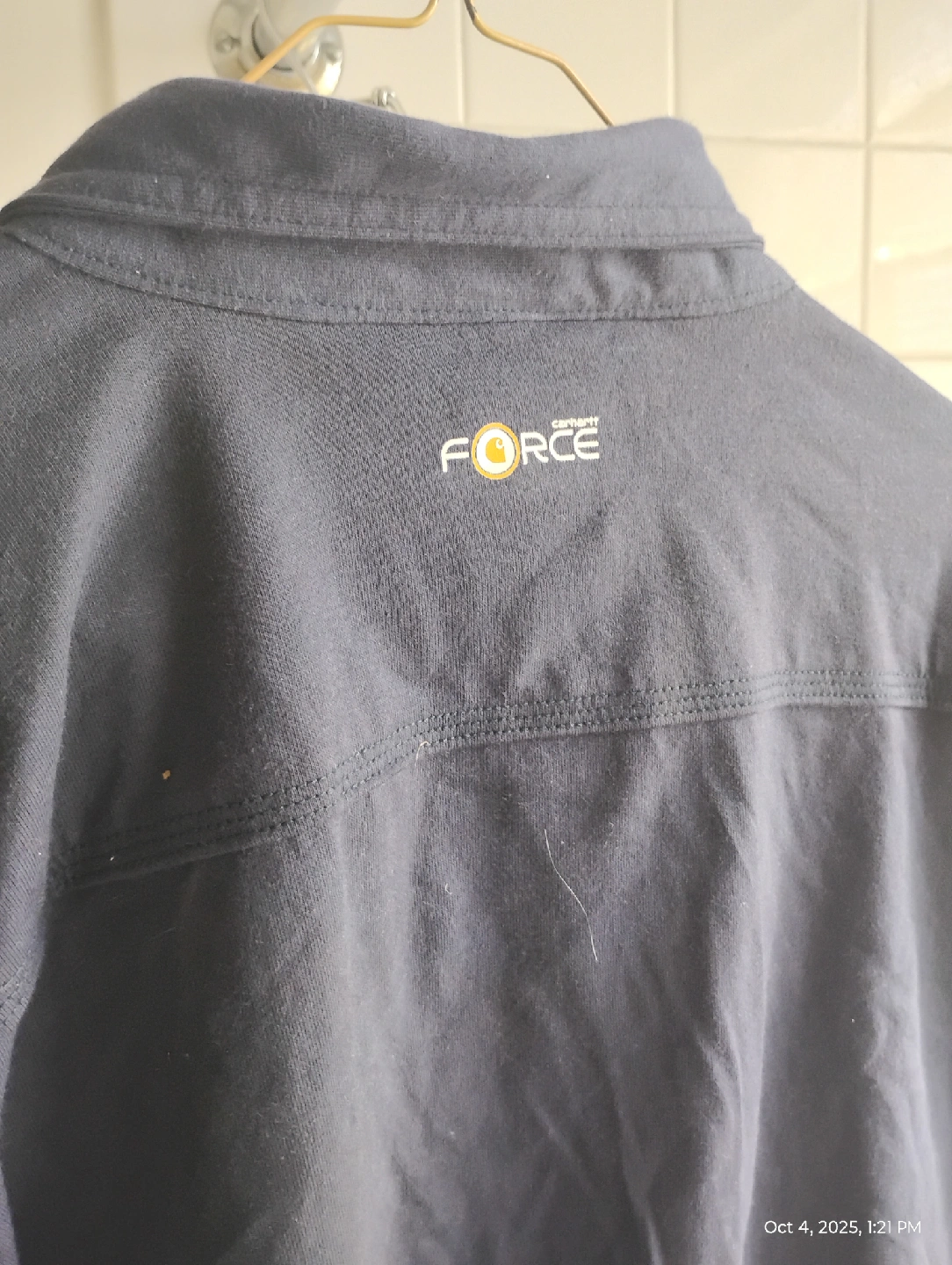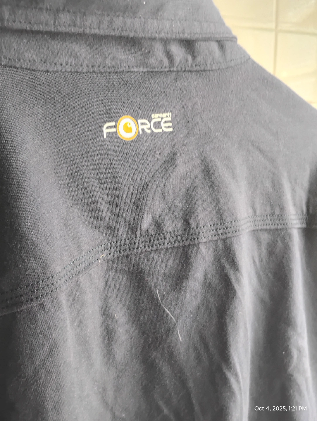 Carhartt Force button down shirt in size XL! It's a dark blue color and appears to be in good condition. Has the Xcel Energy logo on the front.