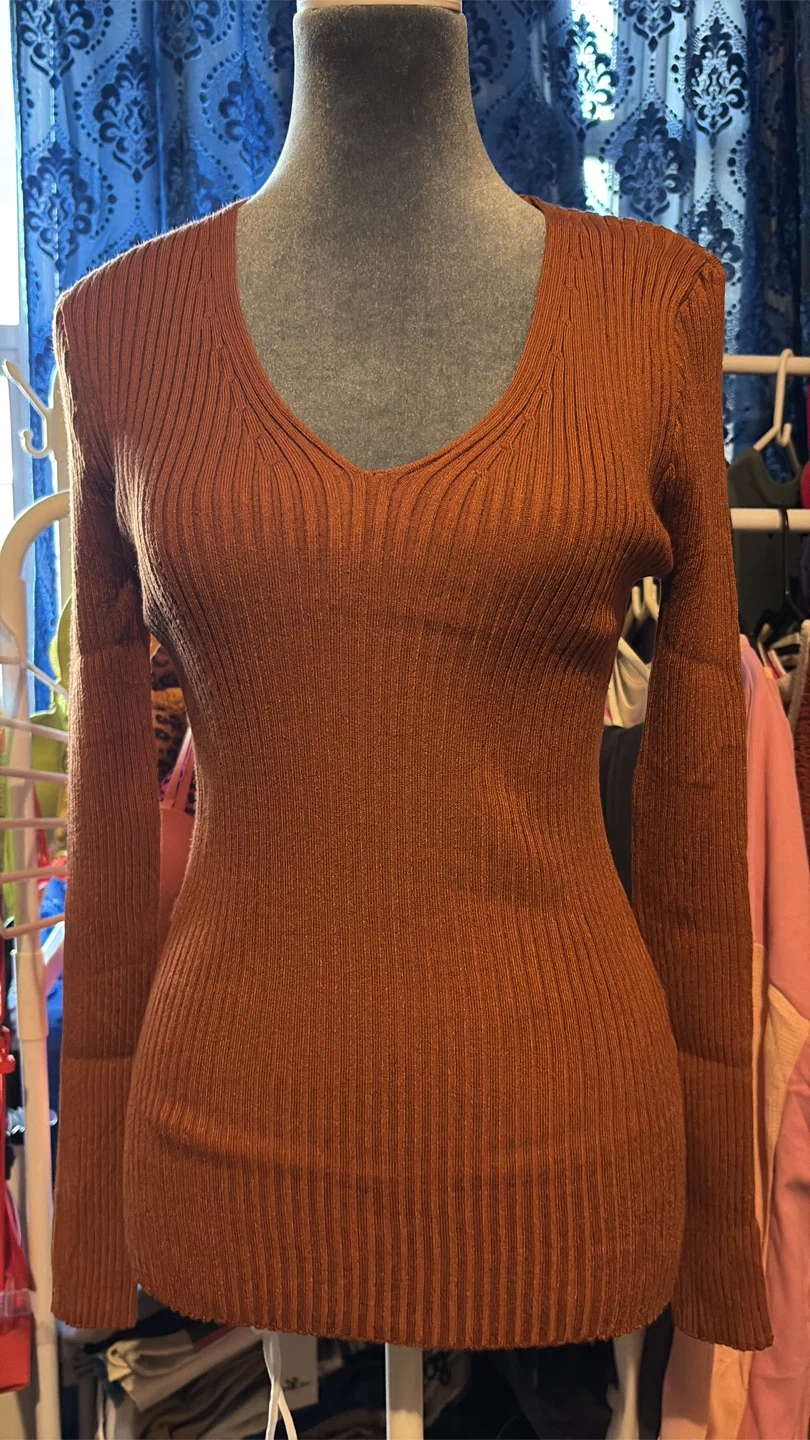 A cozy rust-colored ribbed knit sweater, perfect for fall! It features a flattering V-neck and long sleeves. The material has a nice texture and the color is a warm, earthy tone