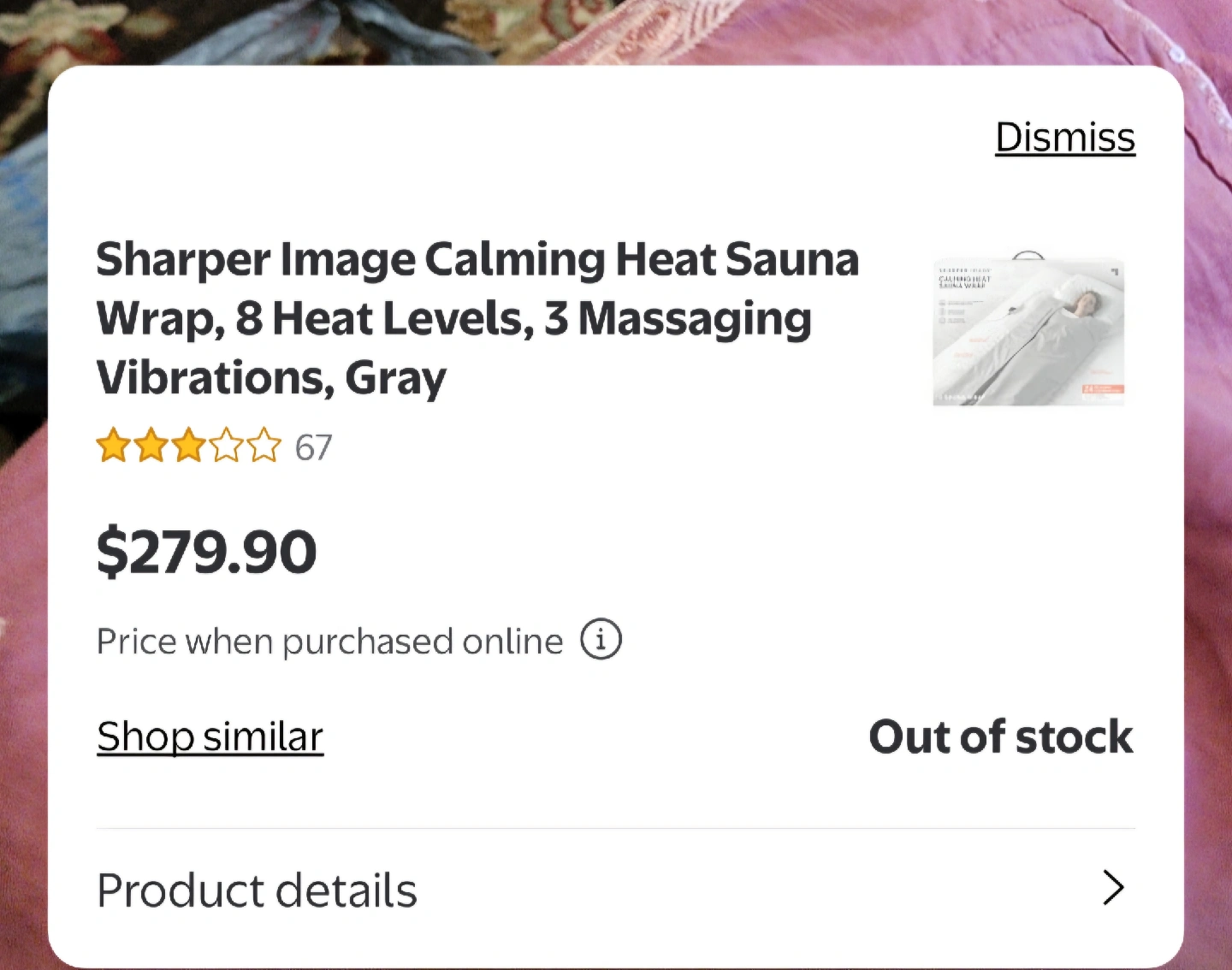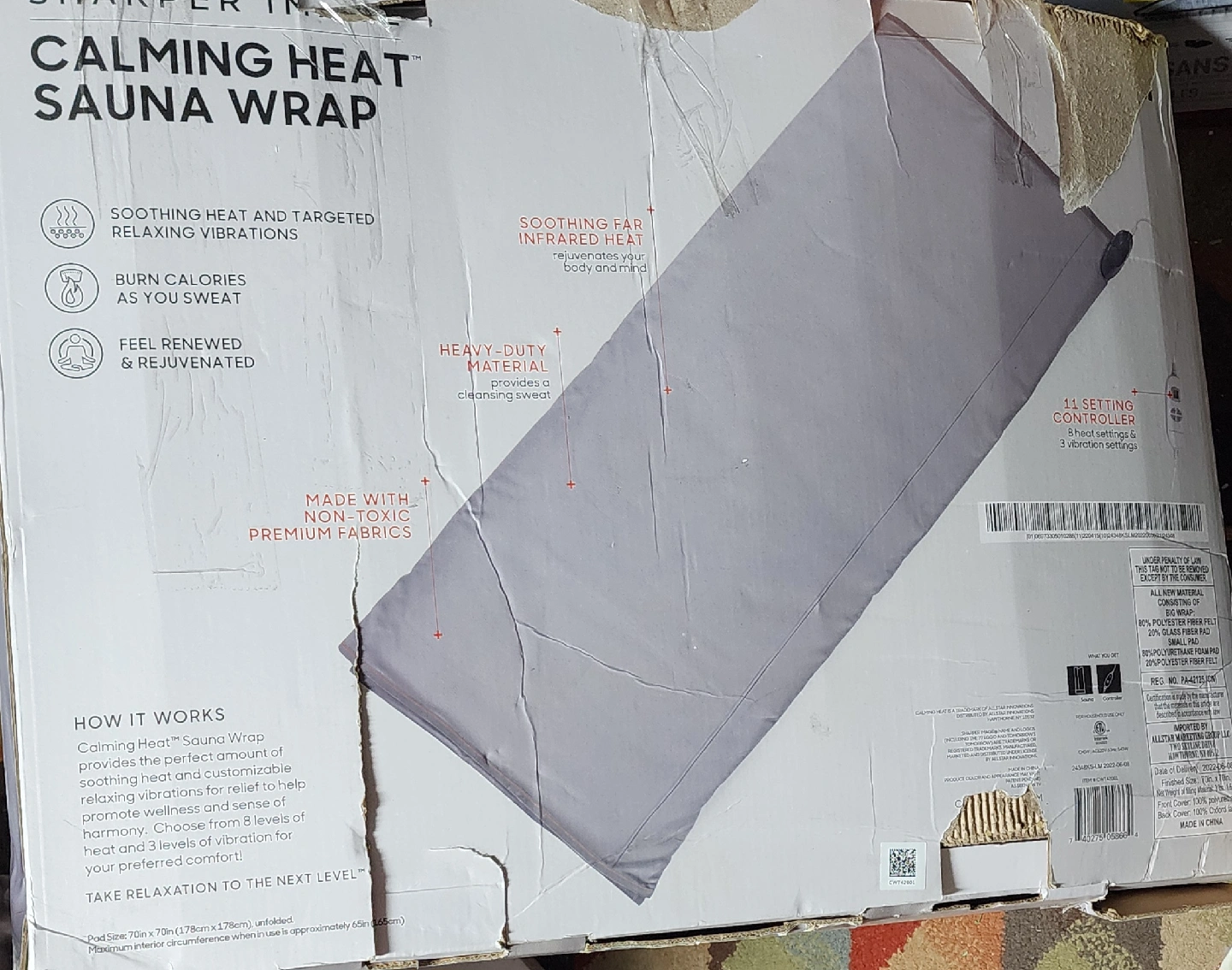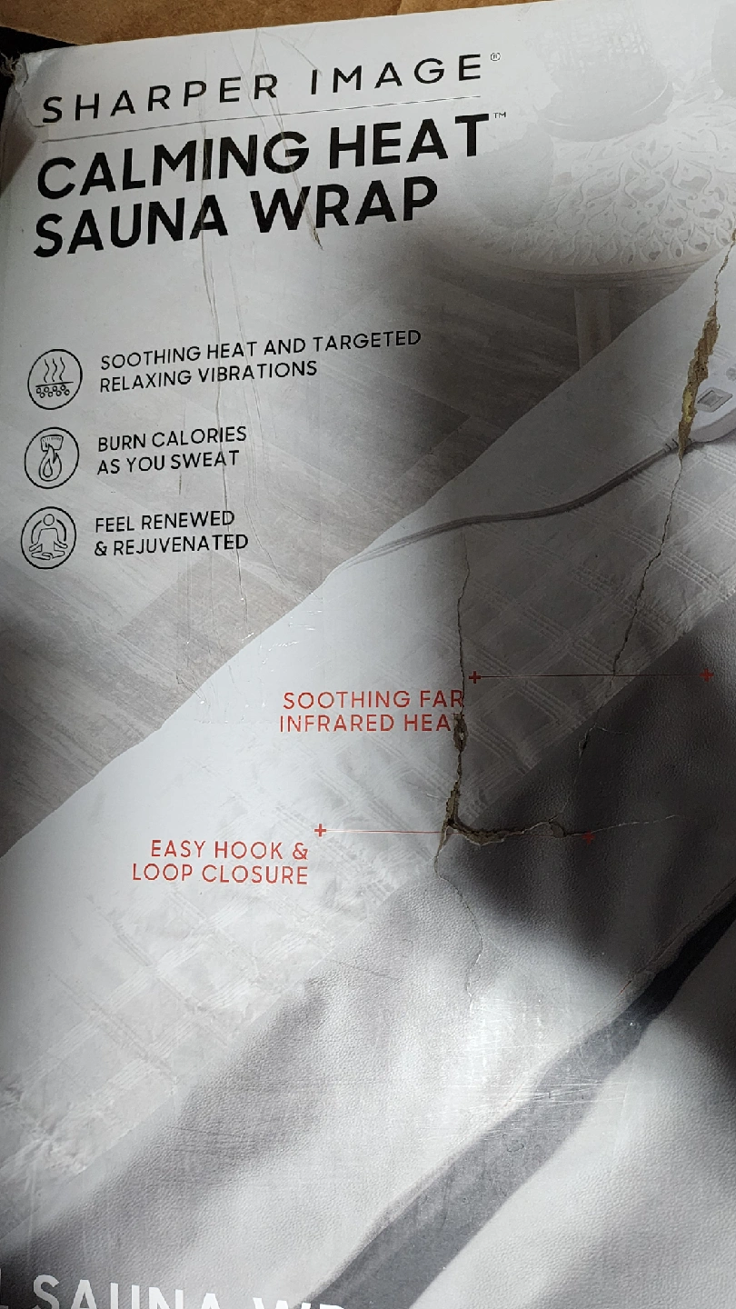 Selling a Sharper Image Calming Heat Sauna Wrap! It features soothing heat and targeted relaxing vibrations and soothing far infrared heat. It's made with non-toxic premium fabrics and has an easy hook & loop closure. There are 24 relaxing combinations with 11 settings (8 heat and 3 vibration) to help you burn calories as you sweat and feel renewed & rejuvenated