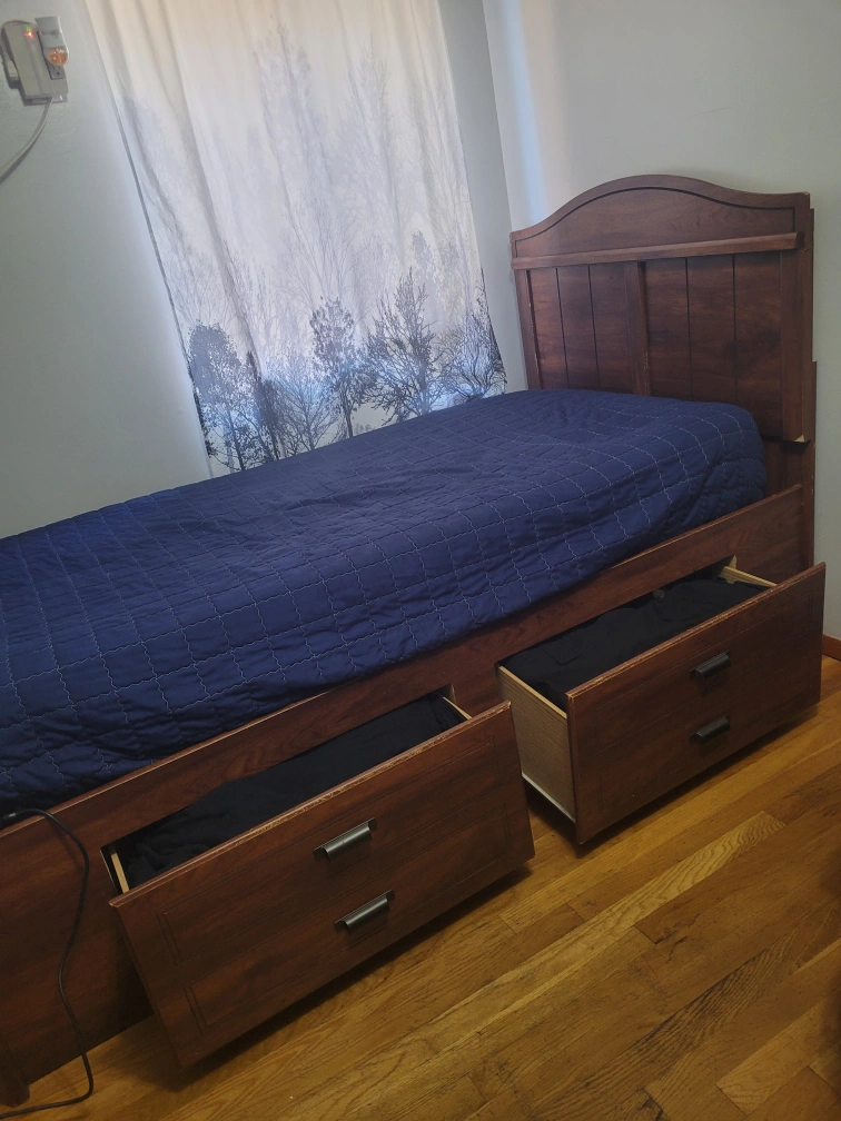 Selling a bed frame with built-in storage drawers. It's in good condition and provides extra storage space, which is always a plus! The color is a dark wood tone. Perfect for a smaller space or anyone needing to maximize storage
