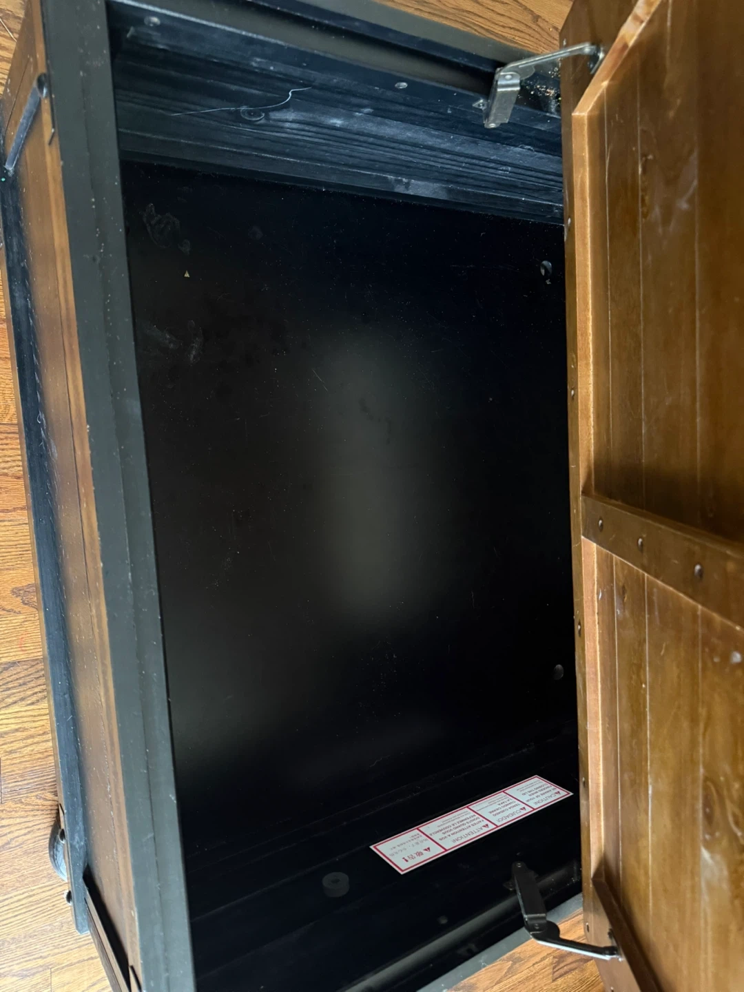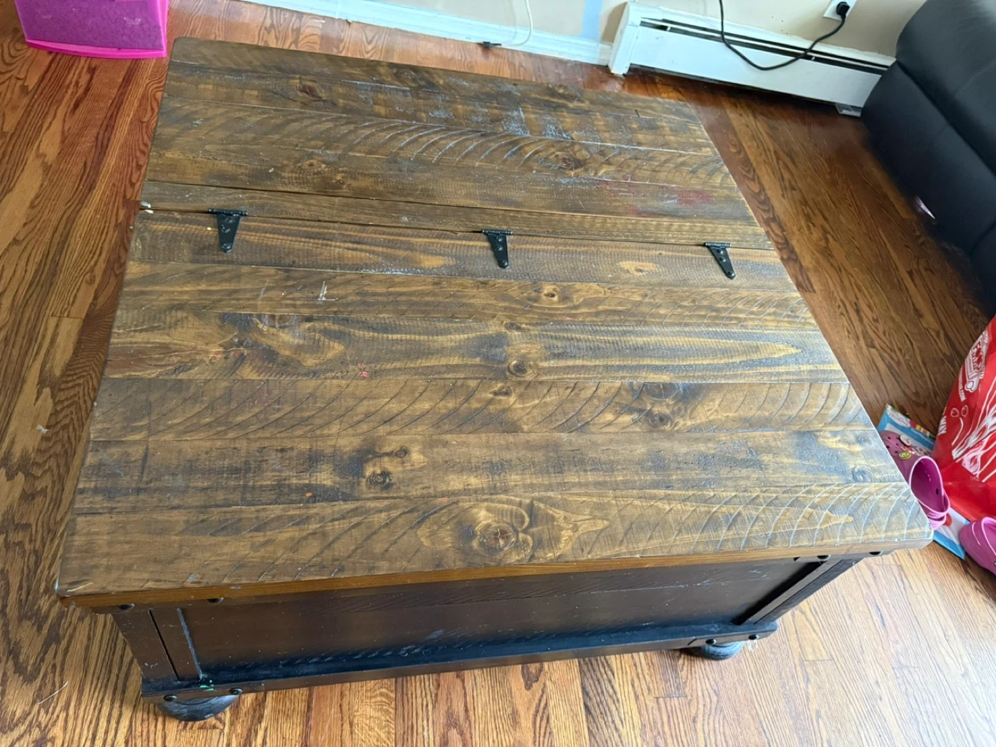 Selling a wooden lift top coffee table. It has a rustic look and a storage compartment inside. Great for living rooms!