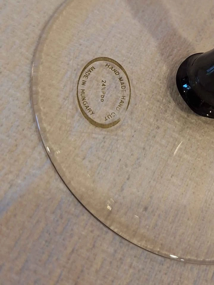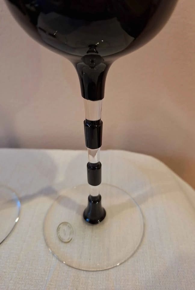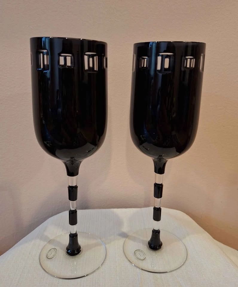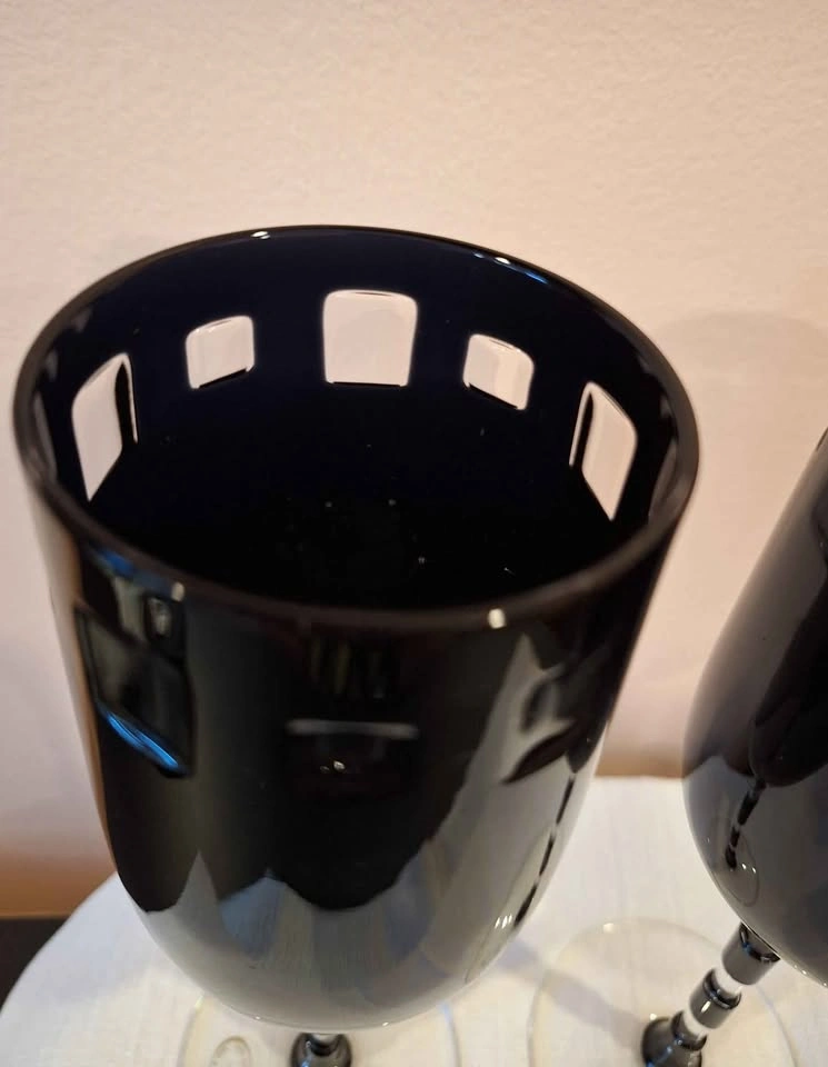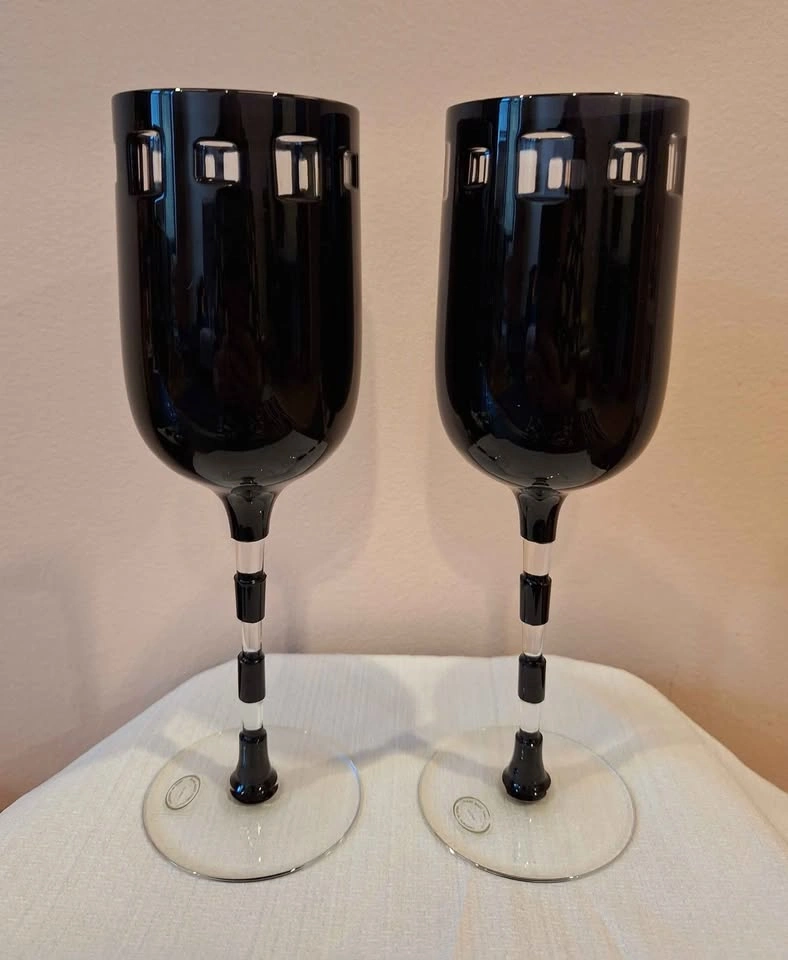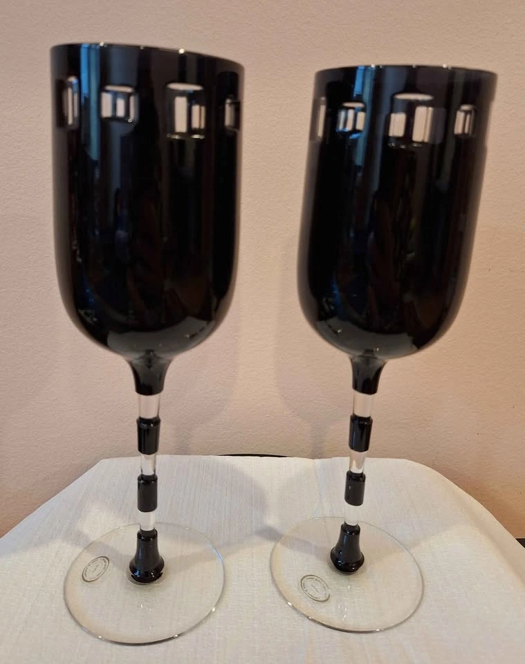 31Pair Ajka Reinheld Black Onyx Cut To Clear Crystal Water or Wine Glasses No chips, cracks or repairs. Never been used. (Lines and spots are just reflections.) Measure 9 1/2” tall and 2 3/4” across top. Listing is for 1 pair (2 glasses.) I have one more pair like this available if you need 4 of them.