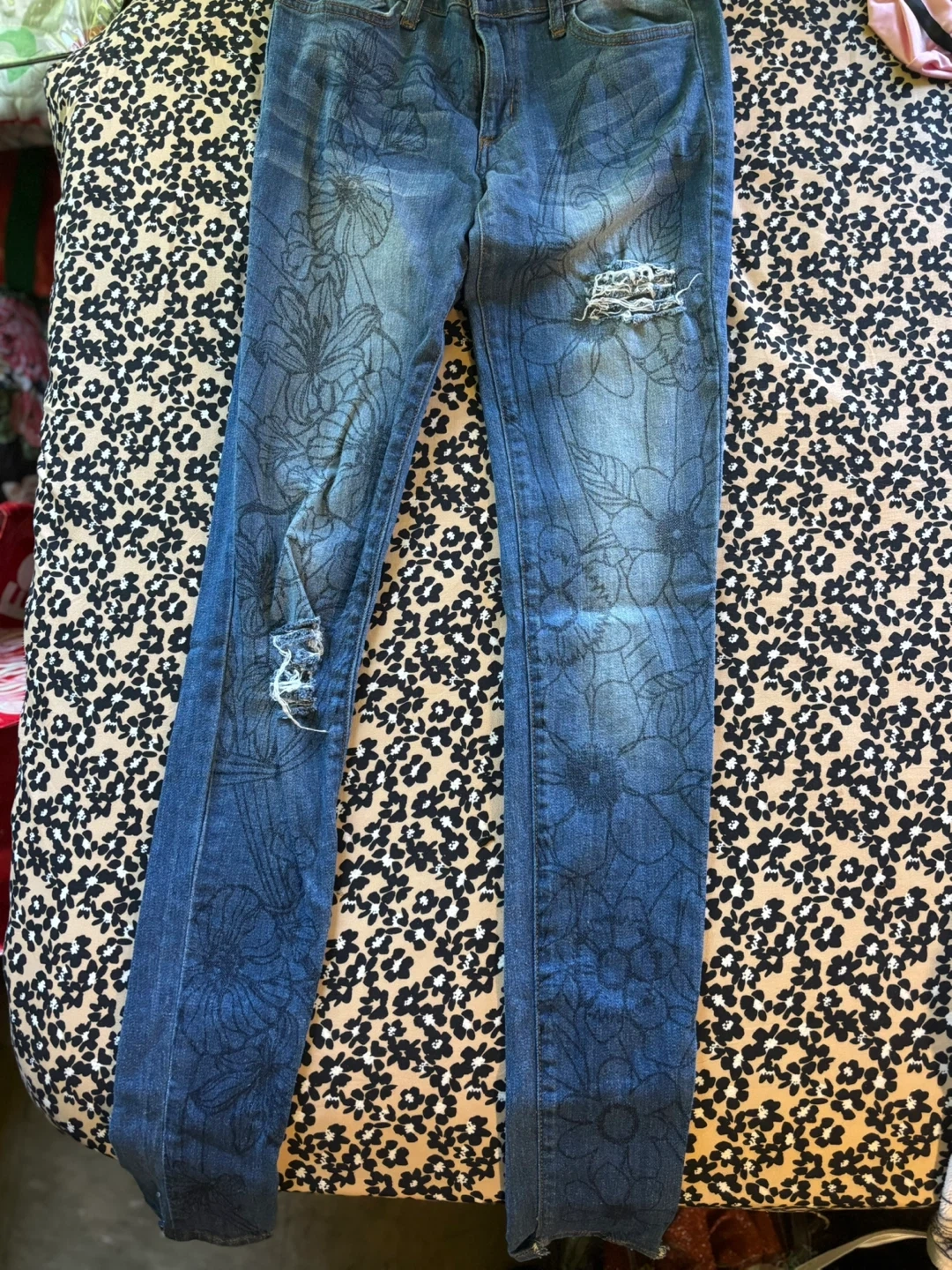 Selling a pair of Aphrodite skinny jeans in size 5! *They do run small!!*They have a unique floral design and a stylish, distressed look.