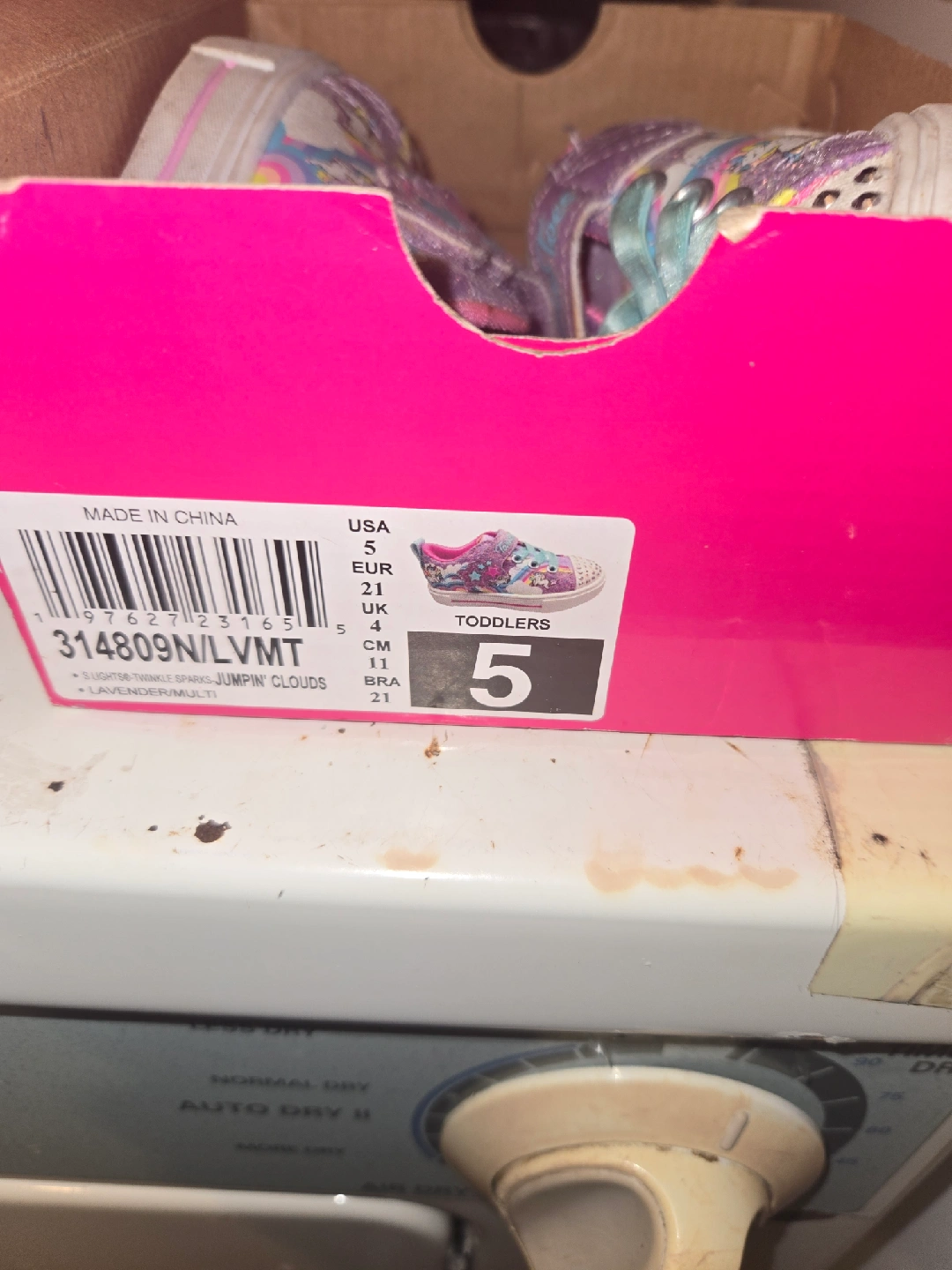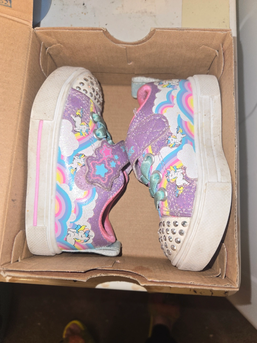 These adorable Skechers Jumpin' Clouds shoes are perfect for your little one! They're a size 5 toddler and feature a cute lavender/multi color scheme with a fun unicorn design. The shoes come in their original box, ready for a new home!