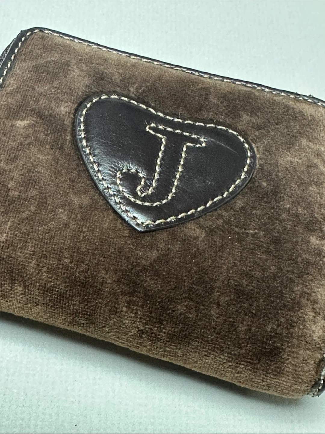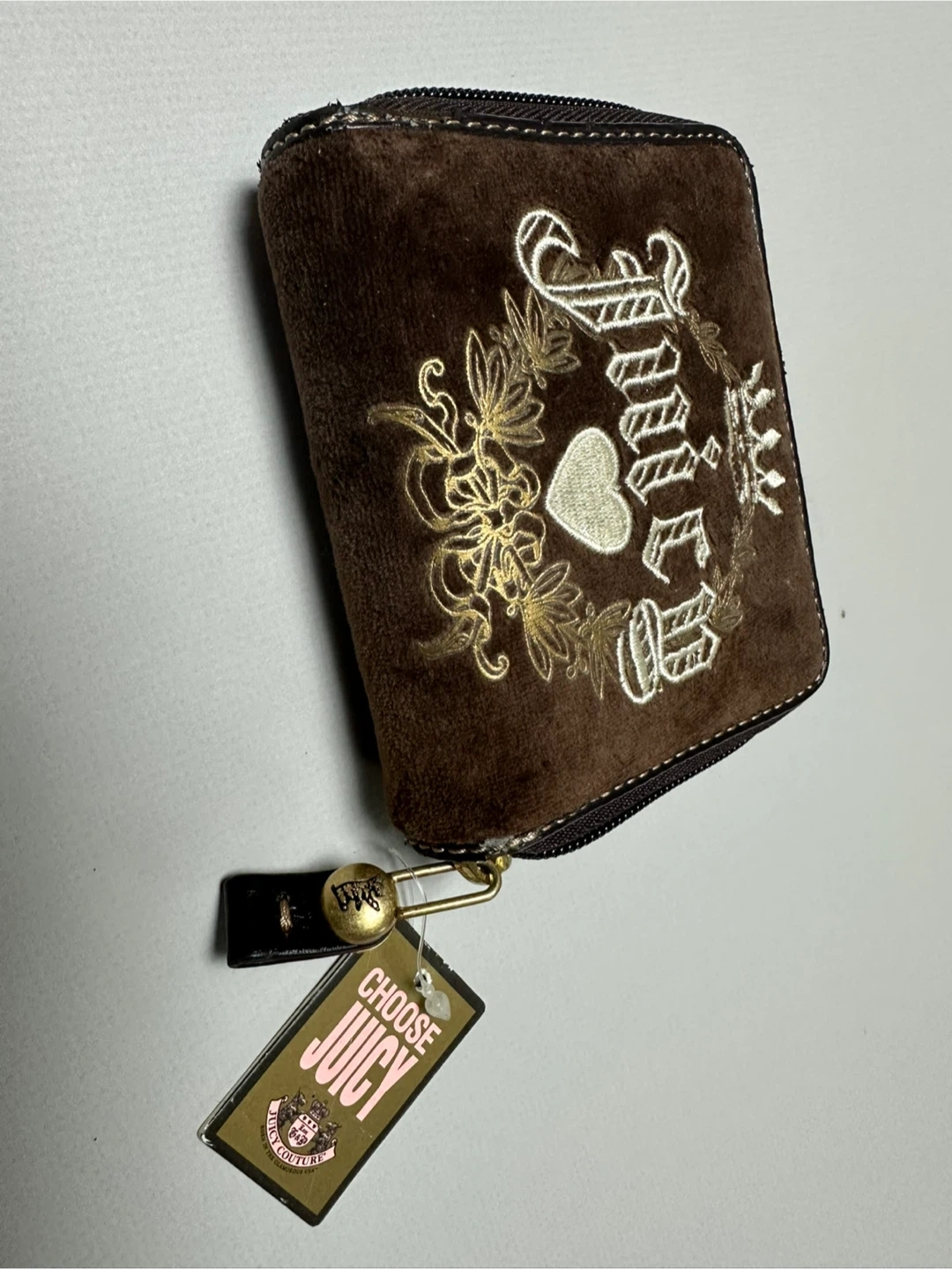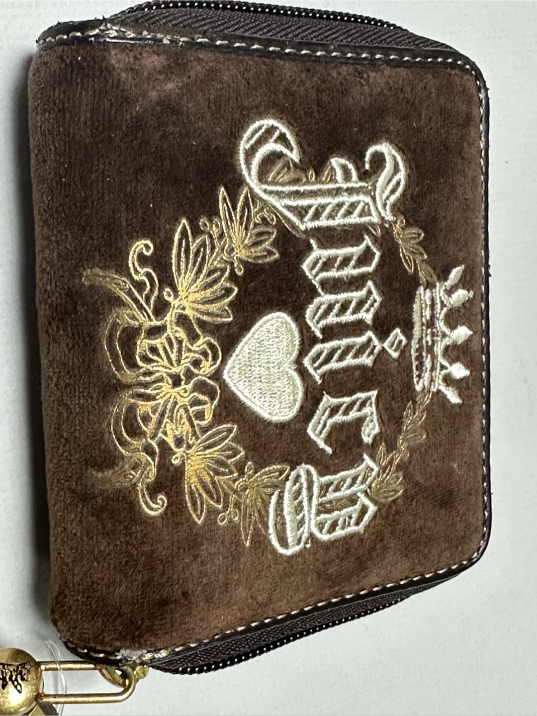 Cute Juicy Couture wallet in a brown velour material! It has the Juicy Couture logo embroidered on the front and a heart detail on the back. Inside it says "Mad Money".