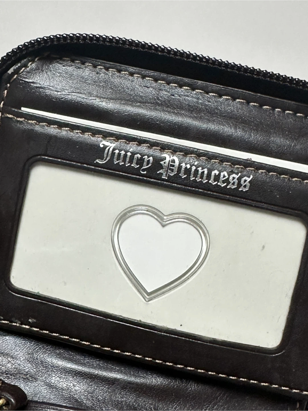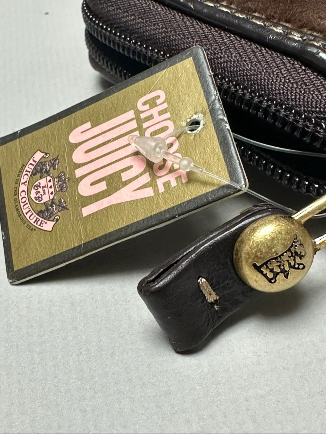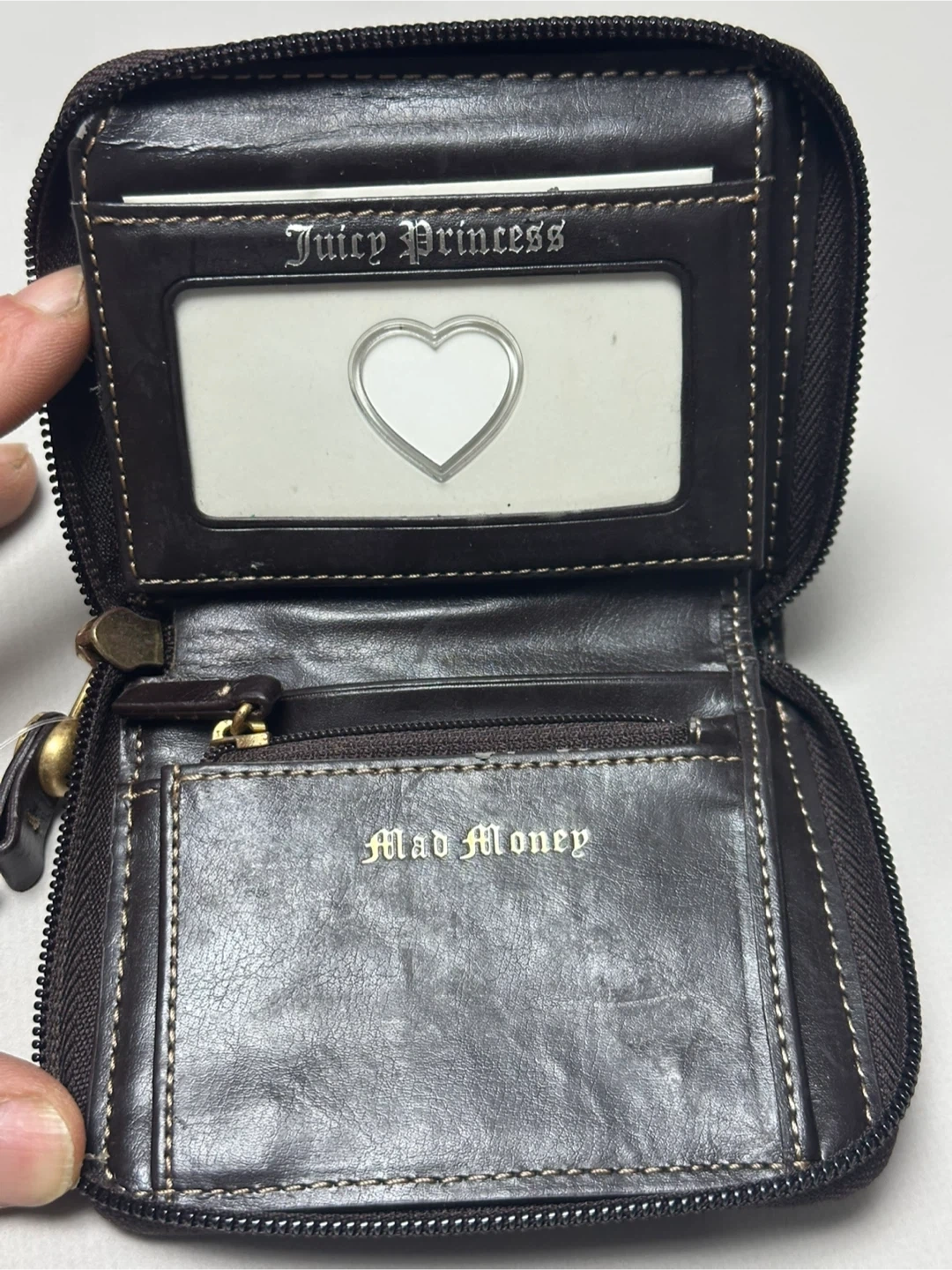 Cute Juicy Couture wallet in a brown velour material! It has the Juicy Couture logo embroidered on the front and a heart detail on the back. Inside it says "Mad Money".