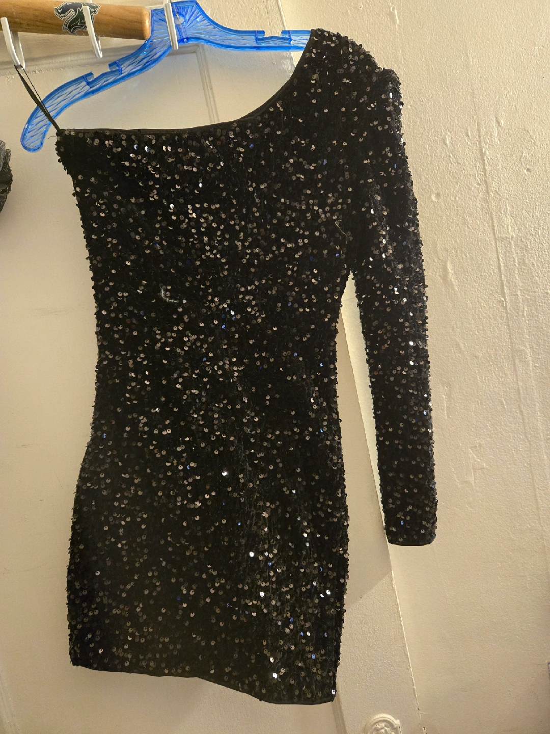 This is a stylish black sequin dress with a one-shoulder design. It's perfect for a night out or a special occasion. The dress features a fitted silhouette and is sure to turn heads!