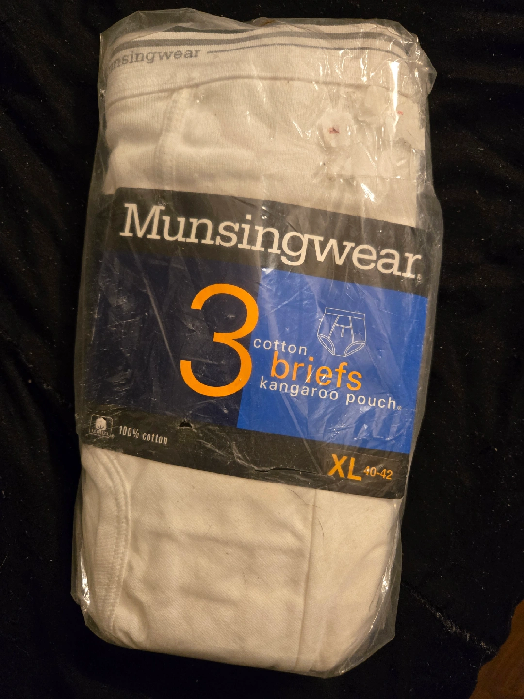 Selling a pack of Munsingwear briefs. This is a 3-pack of white cotton briefs with a kangaroo pouch. Size is XL (40-42).