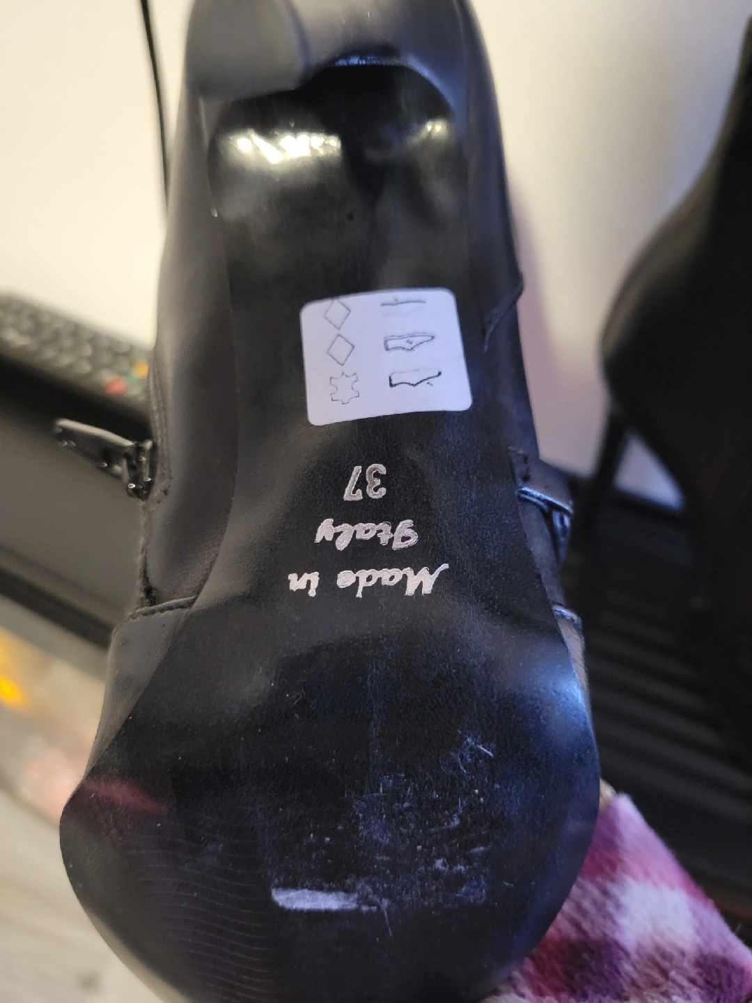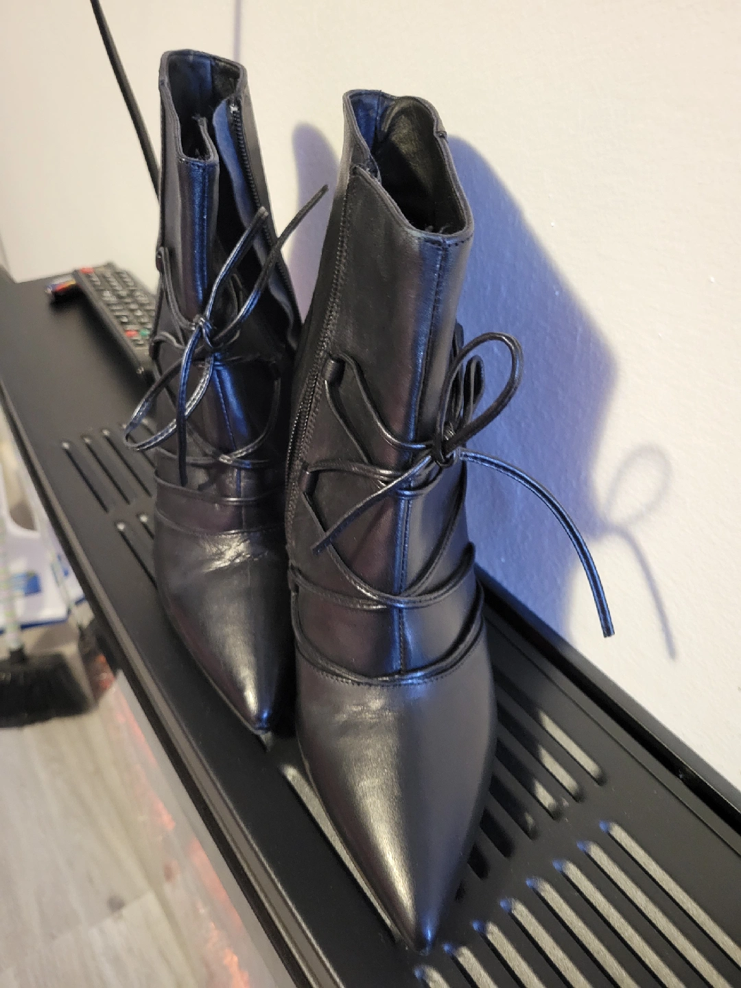 10Stylish black leather ankle boots from Town Shoes! These boots are a size 37 (which is a US size 7). They feature a pointed toe and a lace-up design on the front. Made in Italy! One time used