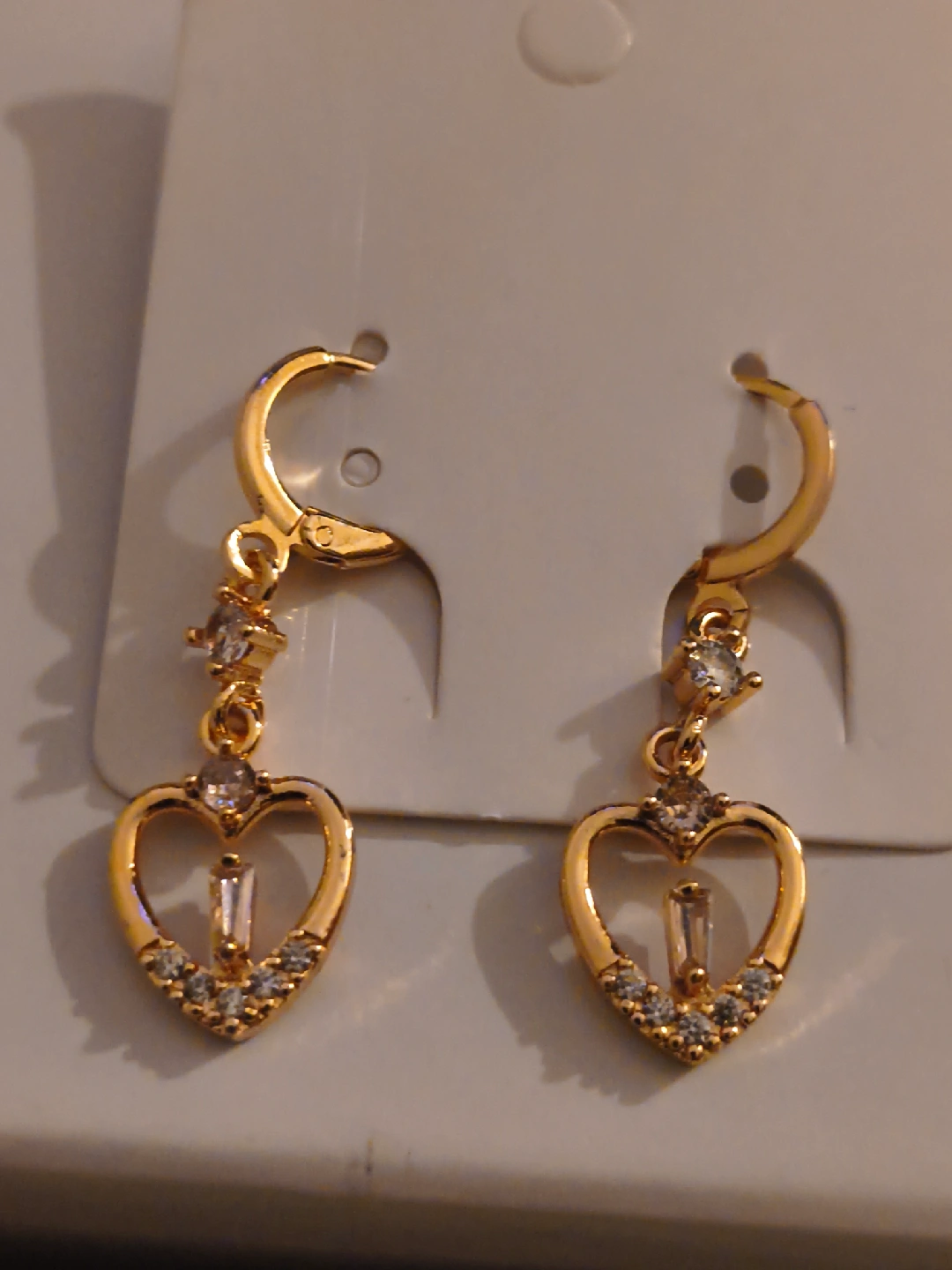 15These are a pair of gold-colored, heart-shaped earrings. They have small, clear stones set around the heart and a few above it. They're in great condition and ready to add a touch of sparkle to any outfit