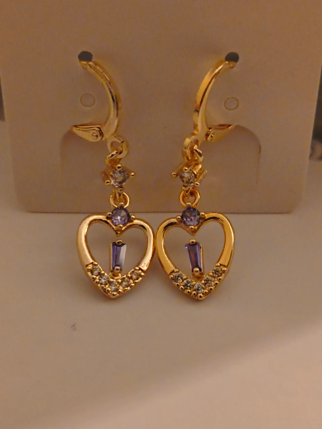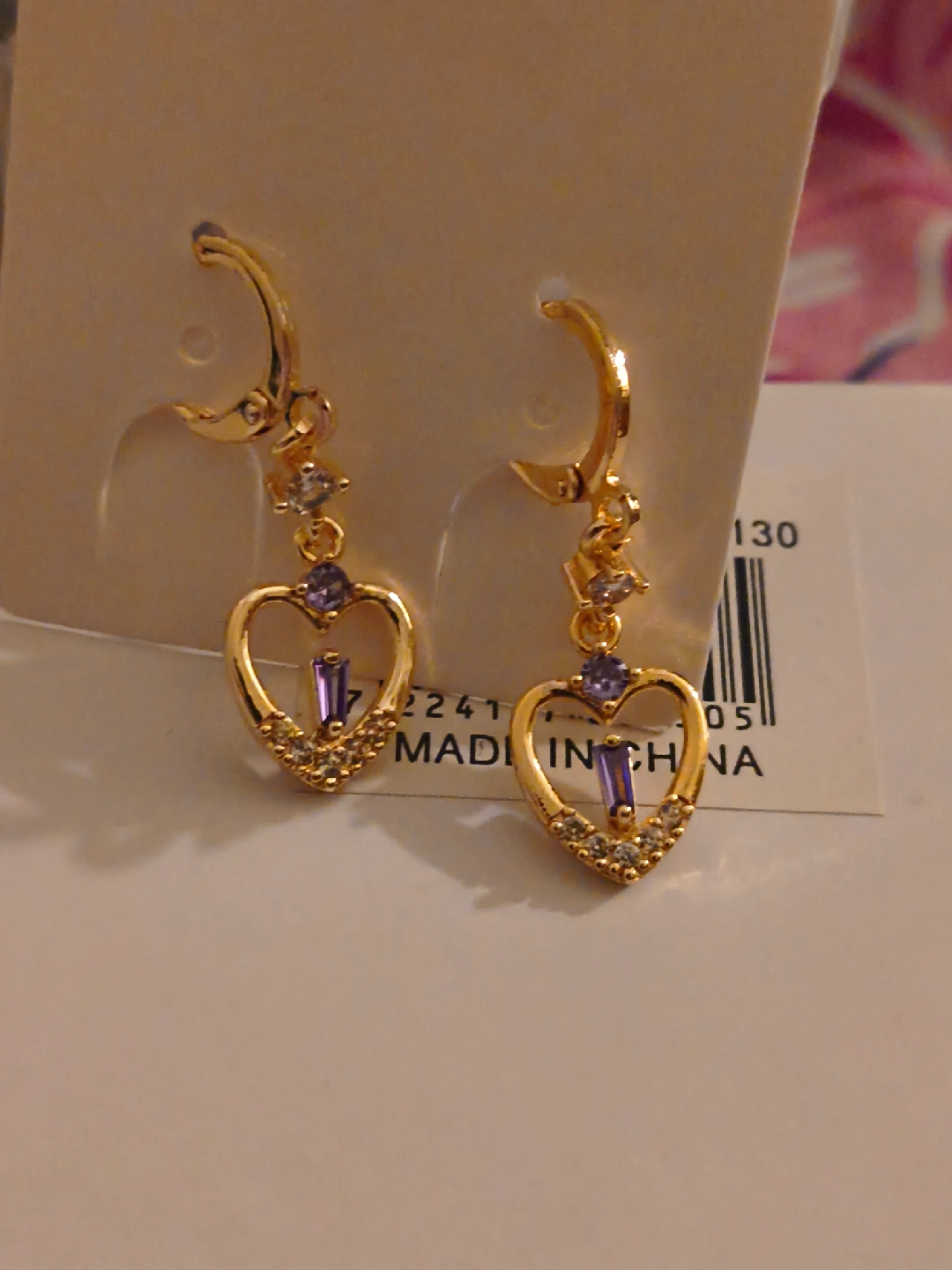 15These are a pair of cute gold heart dangle earrings! They feature a heart shape with small white and purple stones. Perfect for adding a touch of sparkle to any outfit