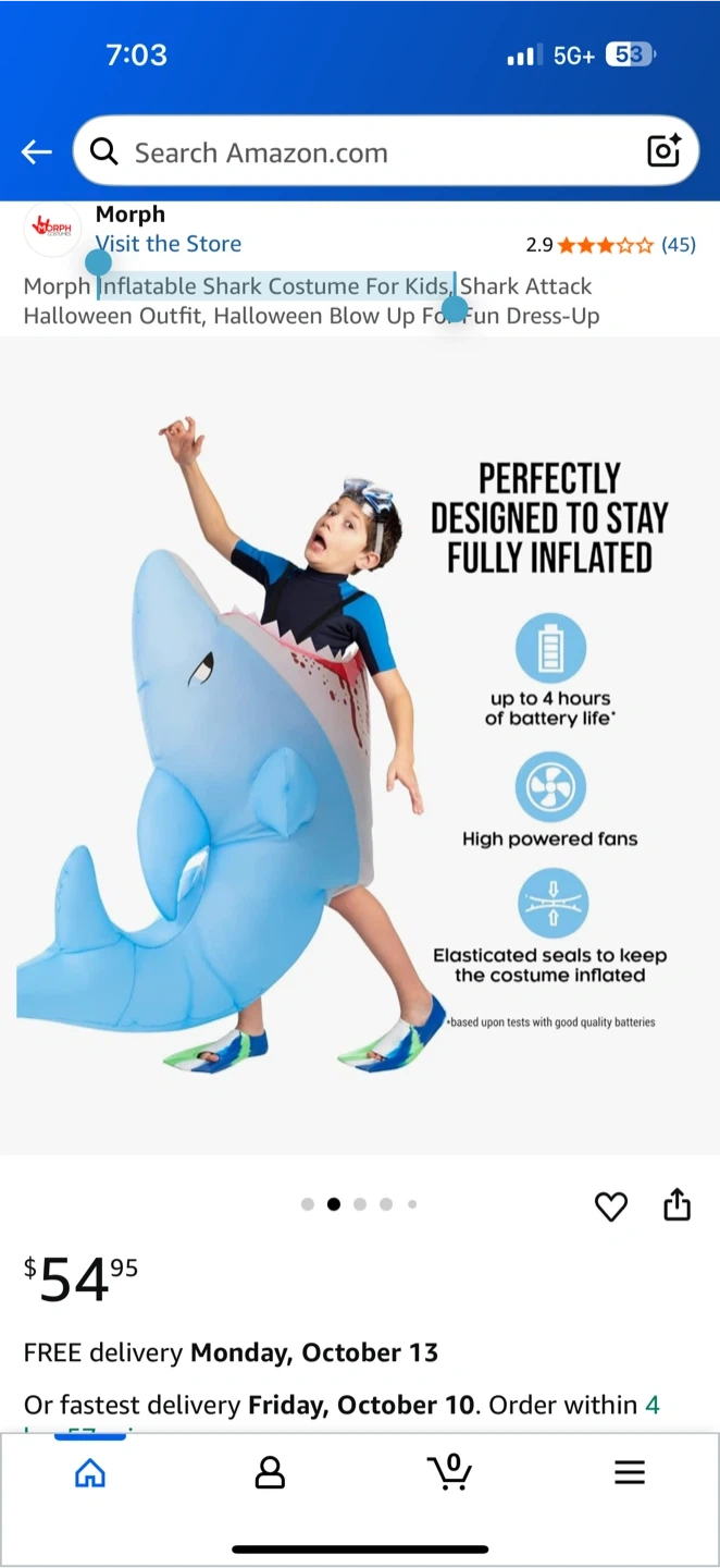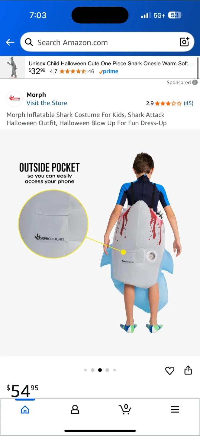 Get ready for some fin-tastic fun with this Morph Inflatable Shark Costume! It's perfect for Halloween or any dress-up occasion. This costume is designed to stay fully inflated, thanks to its high-powered fans and elasticated seals. It even has an outside pocket for easy access to your phone. Originally listed for $54.95
