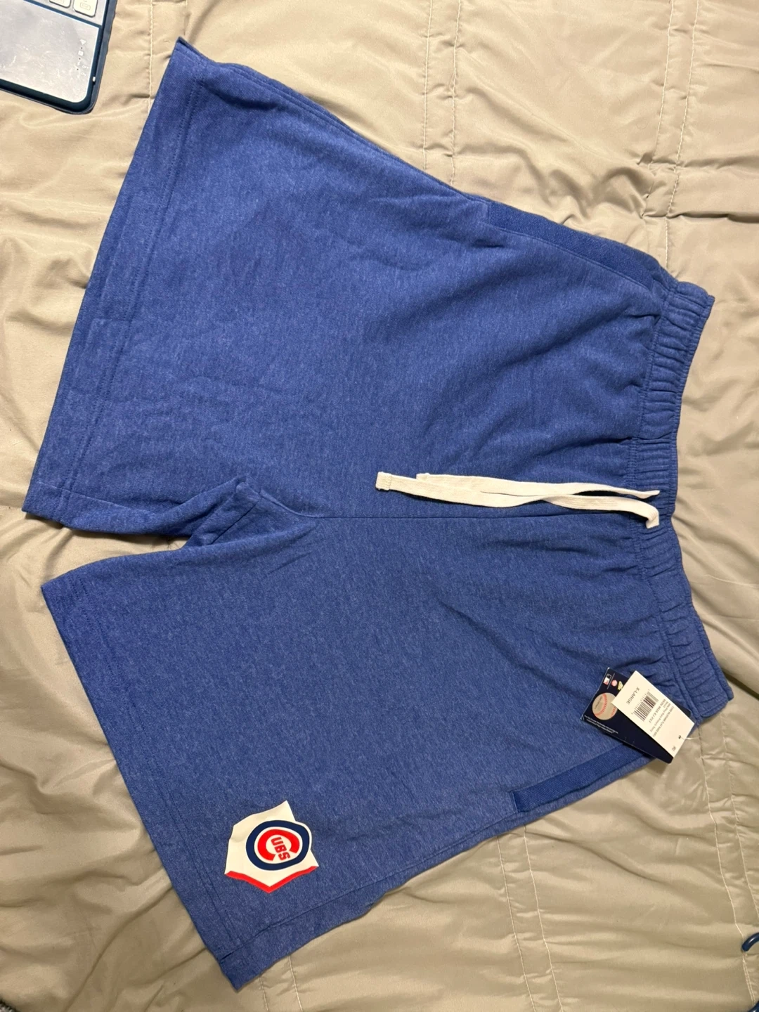 Selling a pair of Chicago Cubs blue shorts in size XL. They feature the Cubs logo and a comfortable drawstring. Perfect for any Cubs fan!