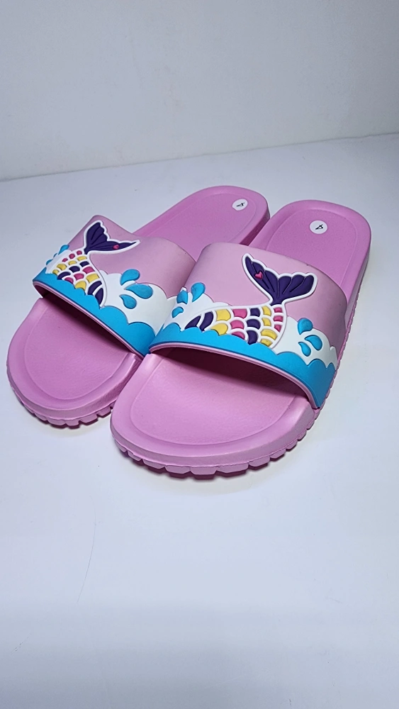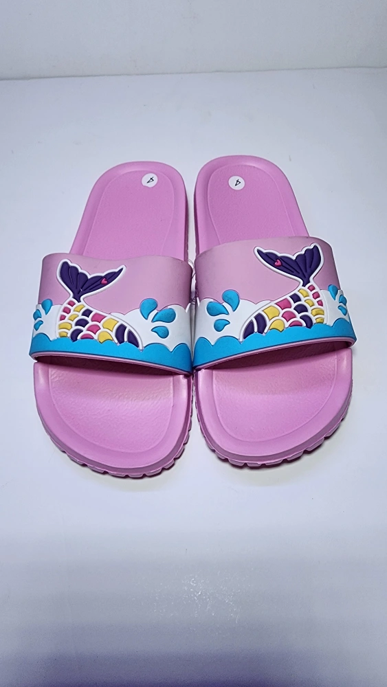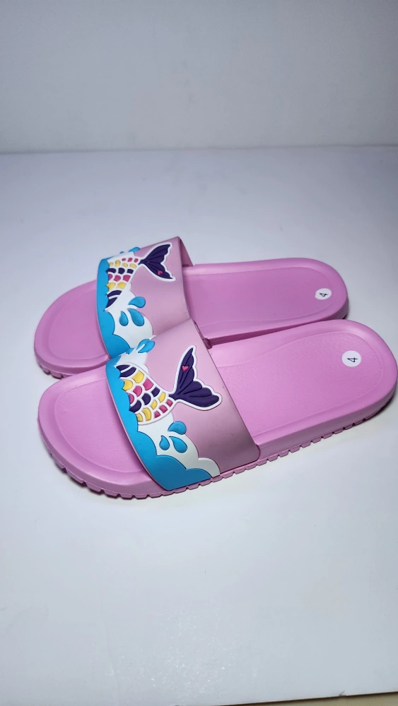 12Cute pink slides featuring a colorful whale tail design! These are in great condition and perfect for little ones. Size 4