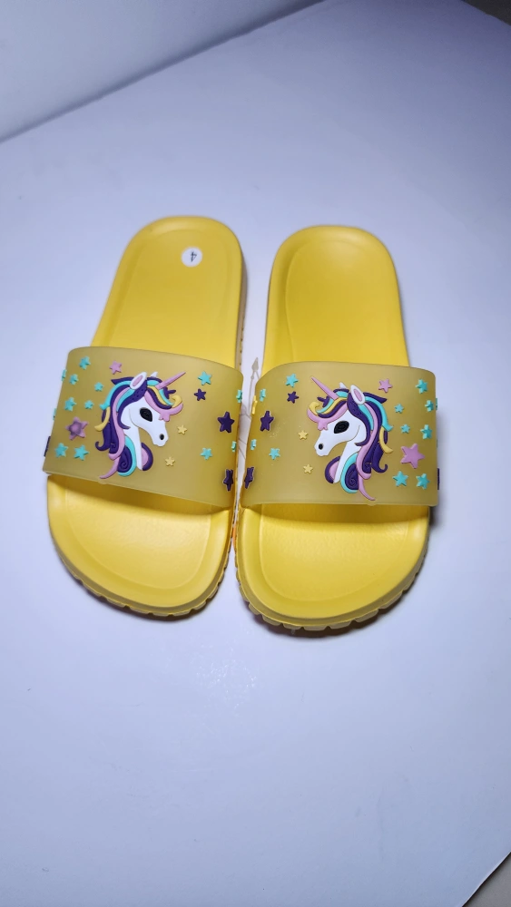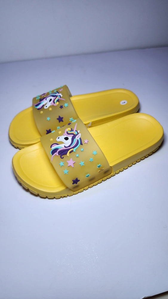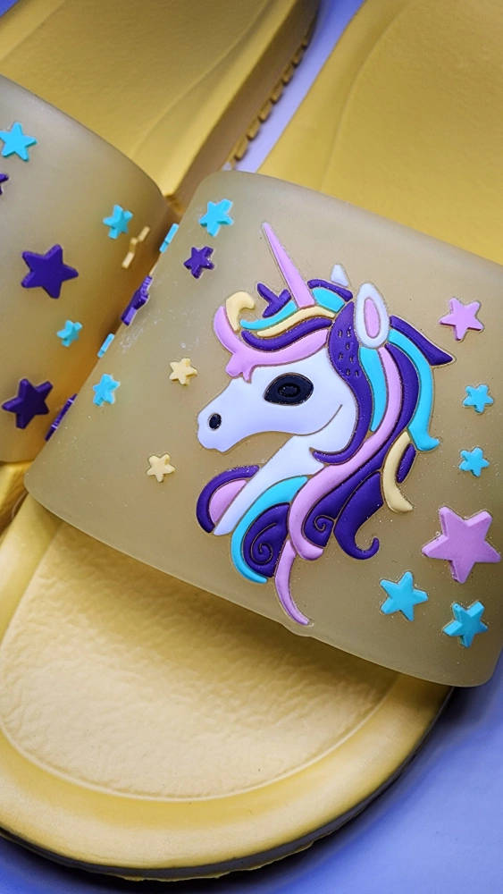 12Cute pair of yellow slides with a unicorn design! These are size 4 and perfect for a little one who loves unicorns and stars