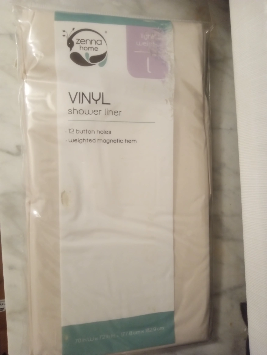I'm selling a new Zenna Home vinyl shower liner! It has 12 button holes and a weighted magnetic hem. It's a light weight liner and measures 70 in (W) x 72 in (H) / 177.8 cm x 182.9 cm