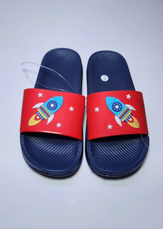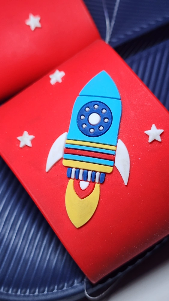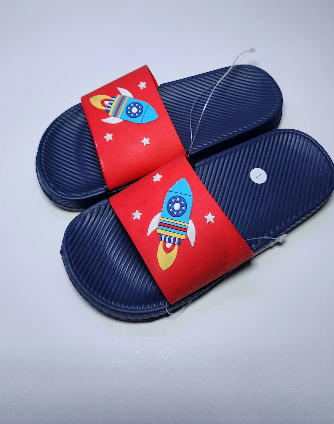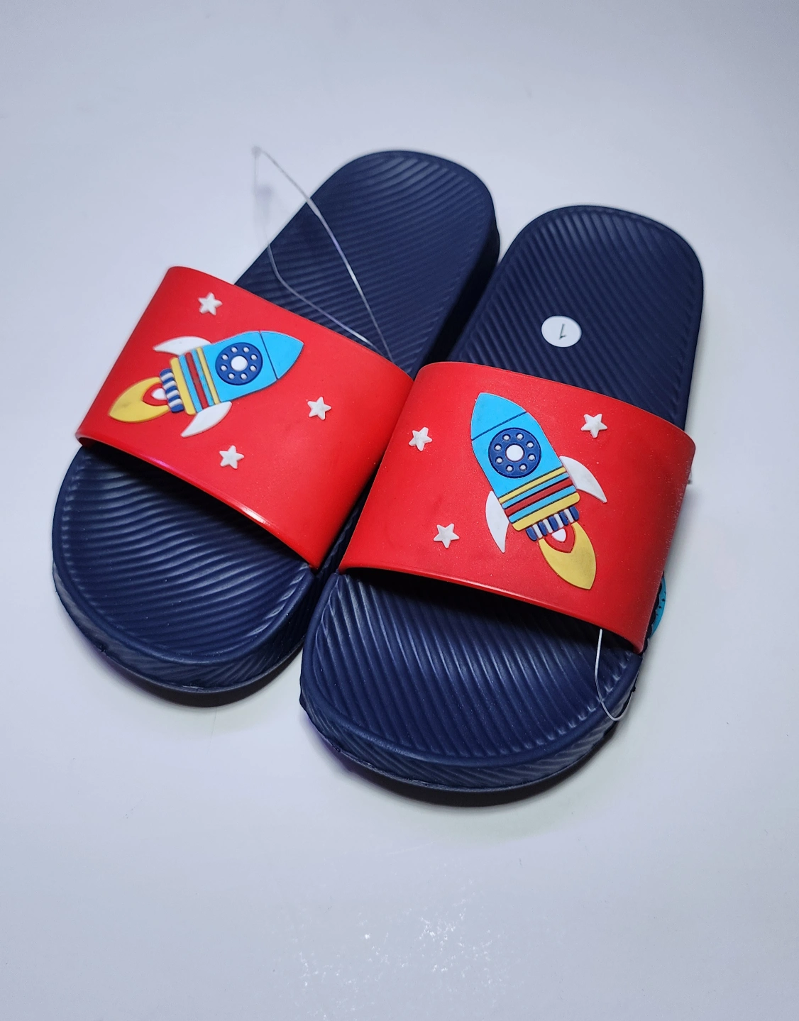 12These adorable kids' slides feature a fun rocket print on a red strap and a blue footbed! They are size 1 (Eu 33) and ready for your little one's adventures