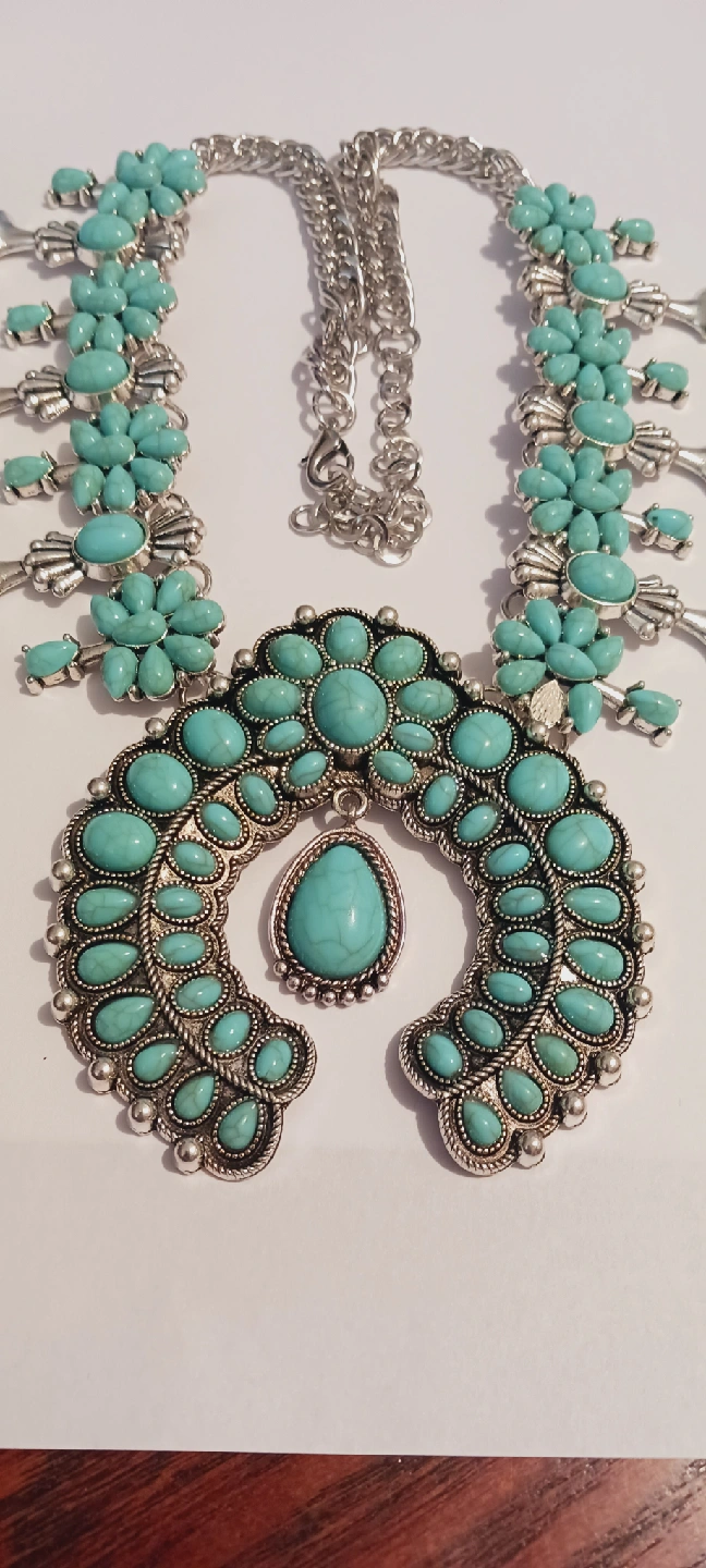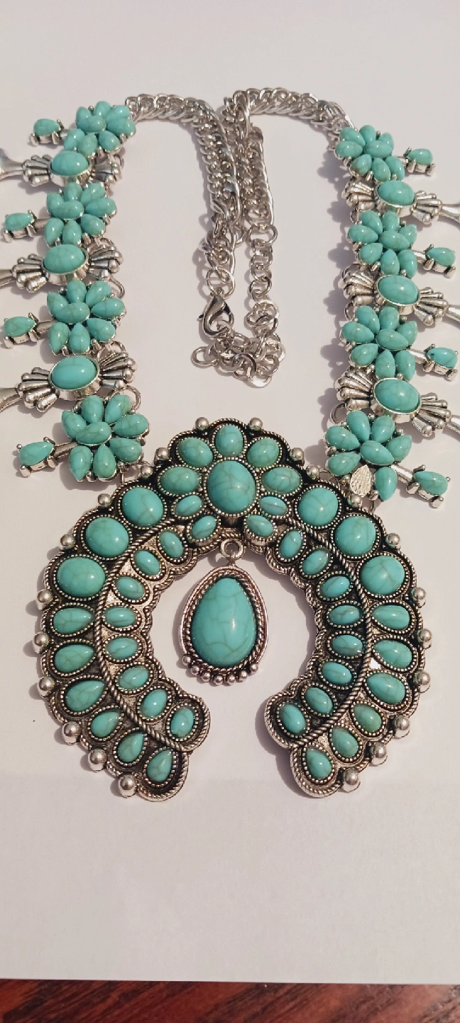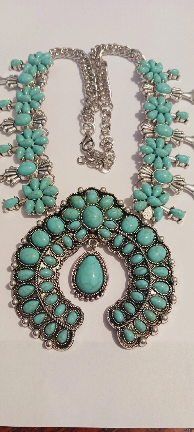 New !!! Beautiful squash blossom necklace with turquoise stones and silver-tone metal. It's perfect for adding a touch of Southwestern style to your wardrobe !!! 20" long. Brand New !!