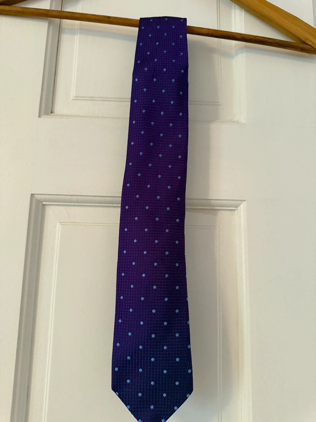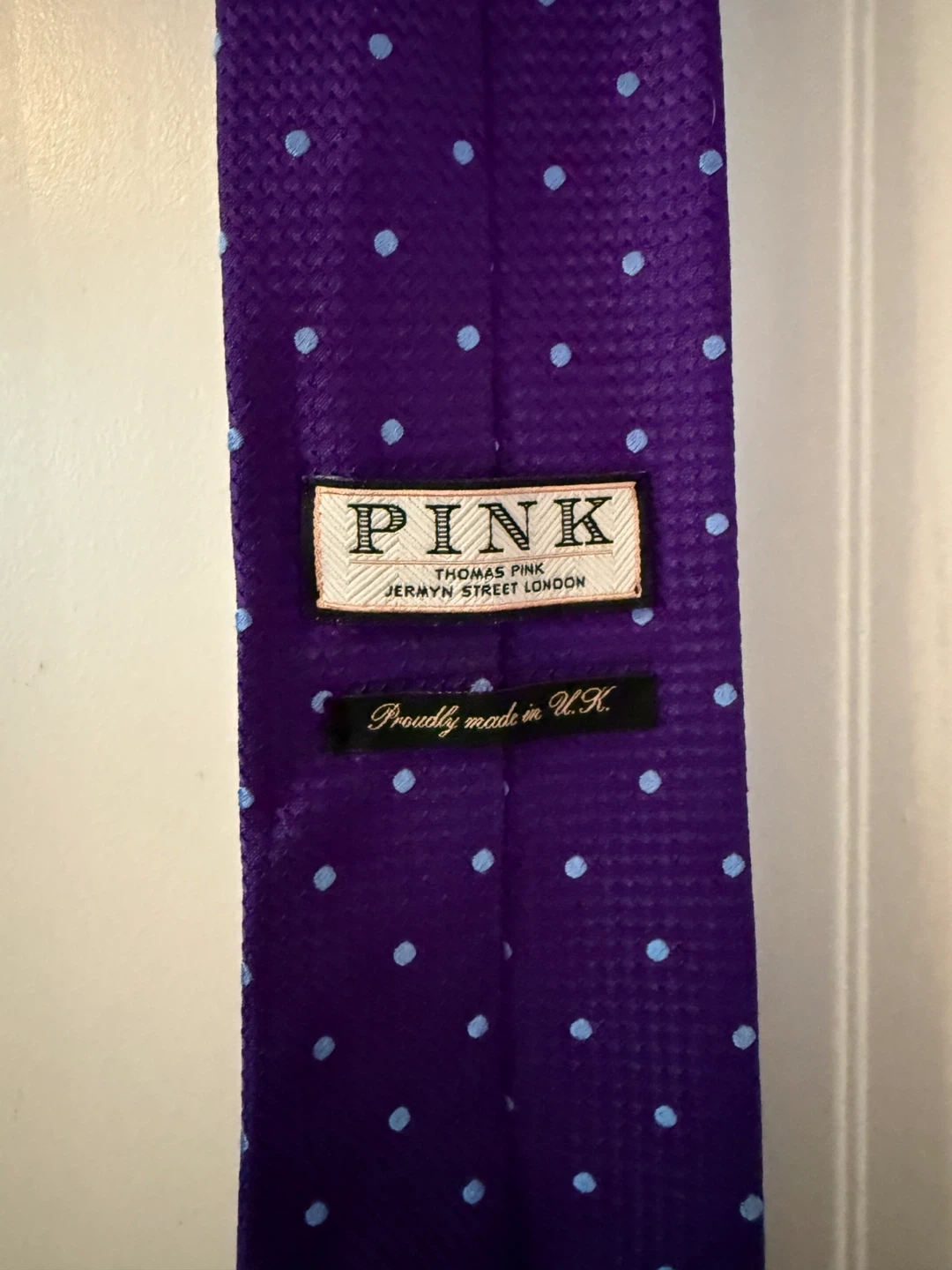 Selling a Thomas Pink tie in purple with light blue polka dots. It's in great condition and ready to wear! Proudly made in the UK.