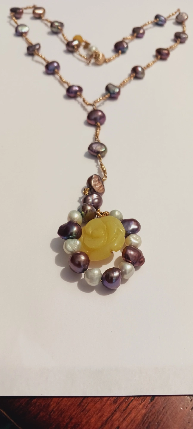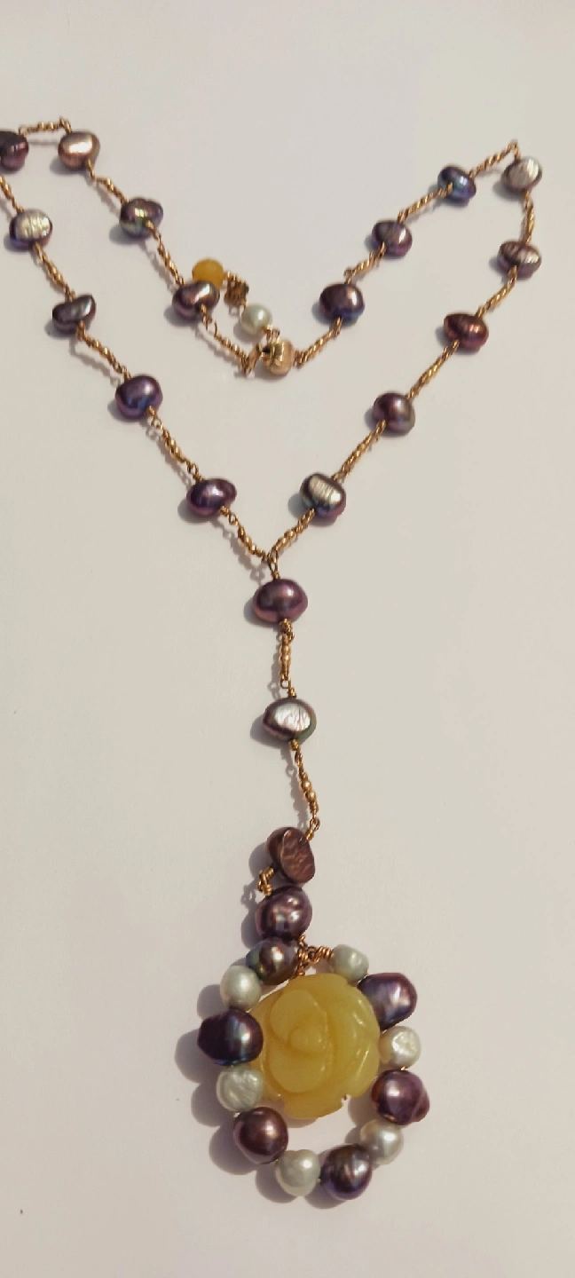 Beautiful Genuine Freshwater Pearl necklace featuring pearls in shades of purple & white. The centerpiece is a unique yellow rose pendant. It's a lovely statement piece! 16" long. Excellent condition, like new !!