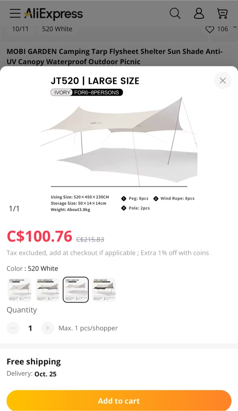 Only used once Get ready for your next outdoor adventure with this MOBI GARDEN JT520 camping tarp! It's perfect for providing shade and shelter. - Large size, suitable for 6-8 people - Colour: 520 White - Dimensions: 520x450x230cm - Includes pegs, wind ropes, and poles Originally listed for C$100.76