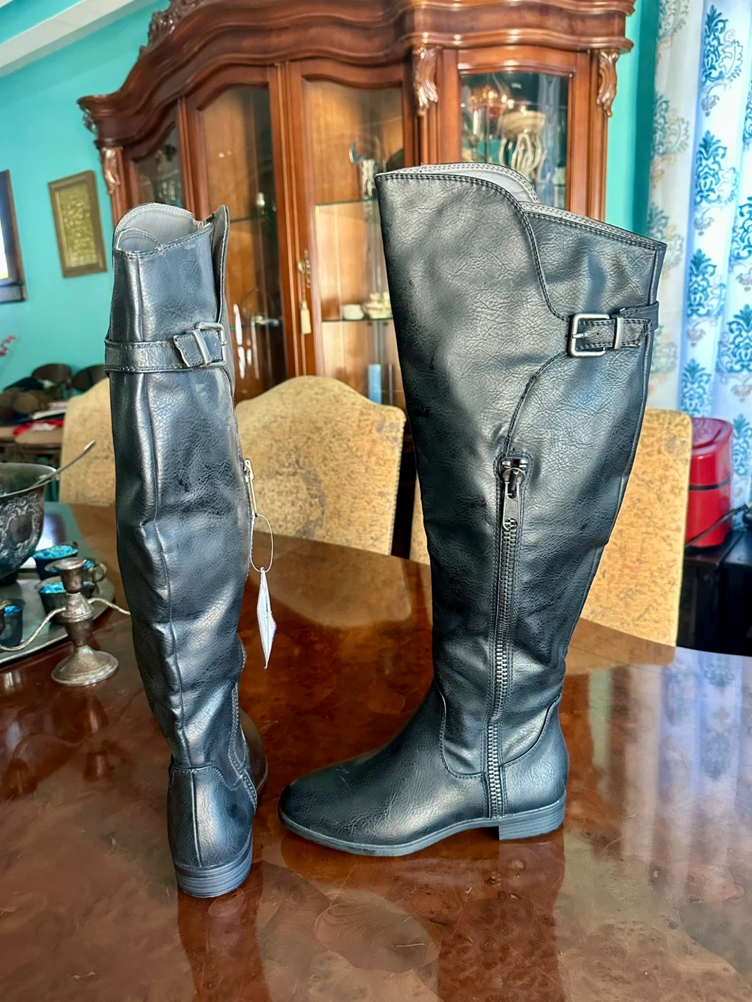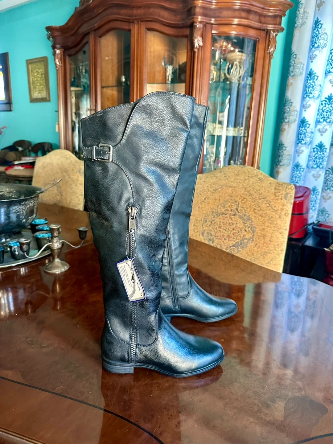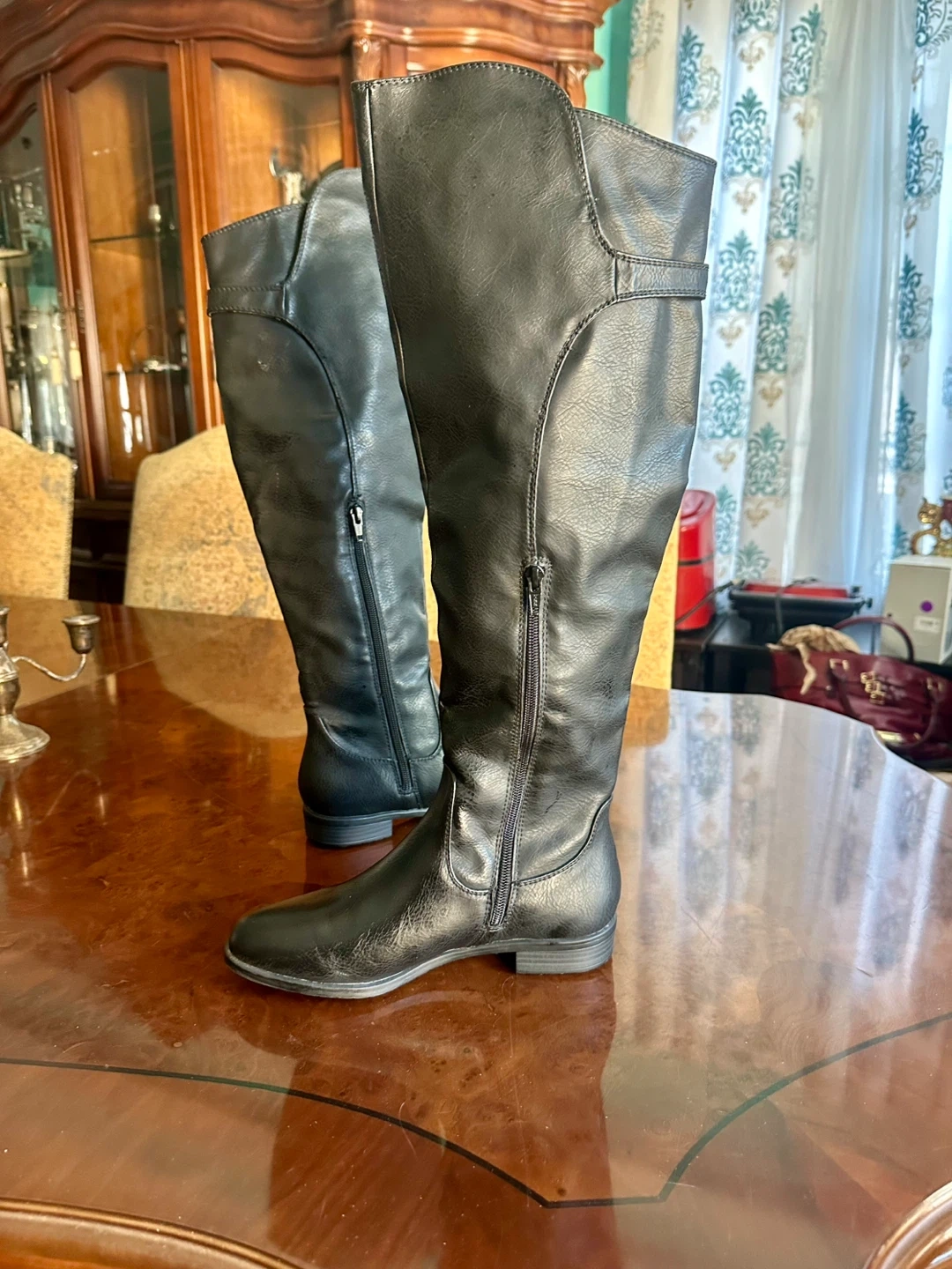 21Selling a pair of Rialto knee-high boots in black. They are a size 7.5M and made of all man-made materials. These stylish boots are perfect for any occasion!