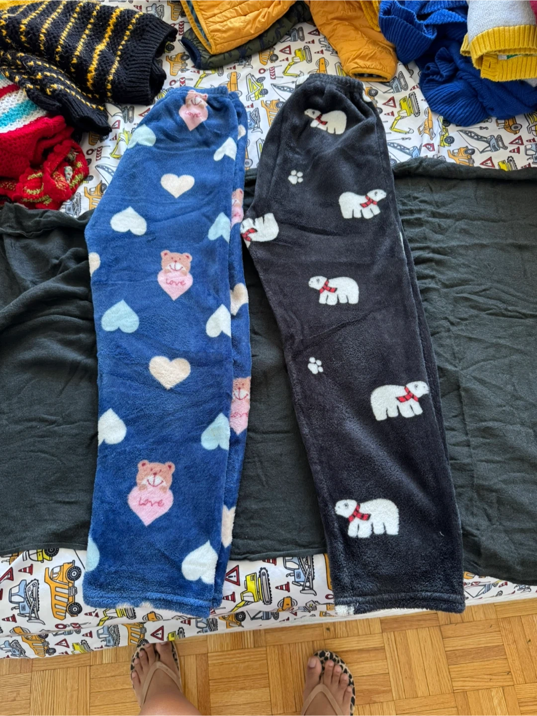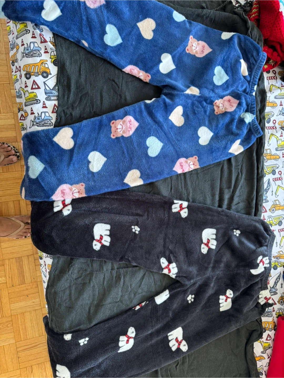 Giving two pairs of pajama pants! One is blue with hearts and bears, and the other is black with polar bears. They're super cozy and perfect for lounging around the house during winters. 30 inch long from waist to hemline.