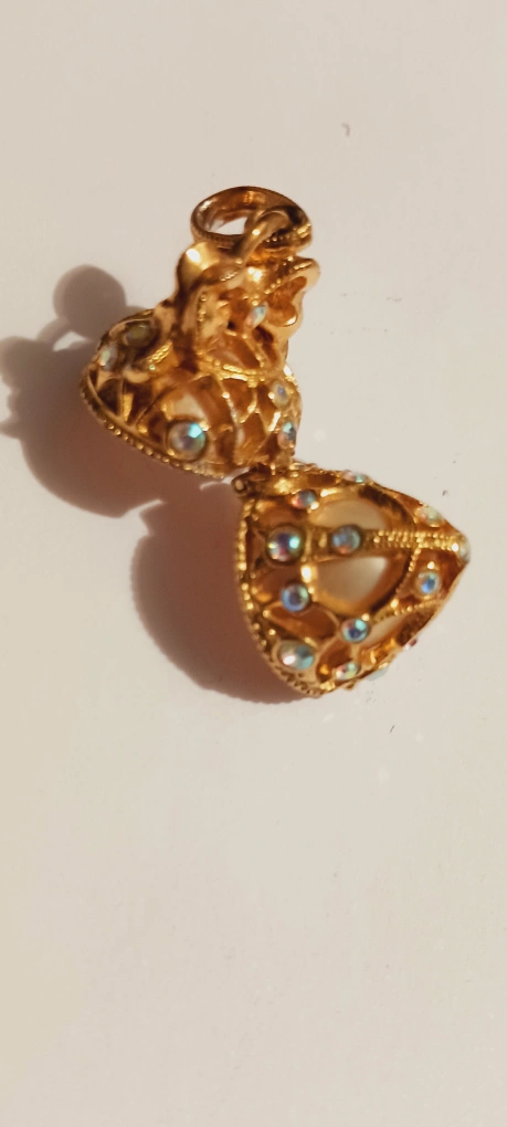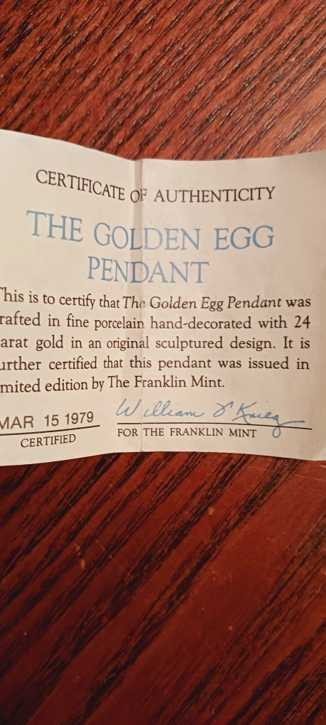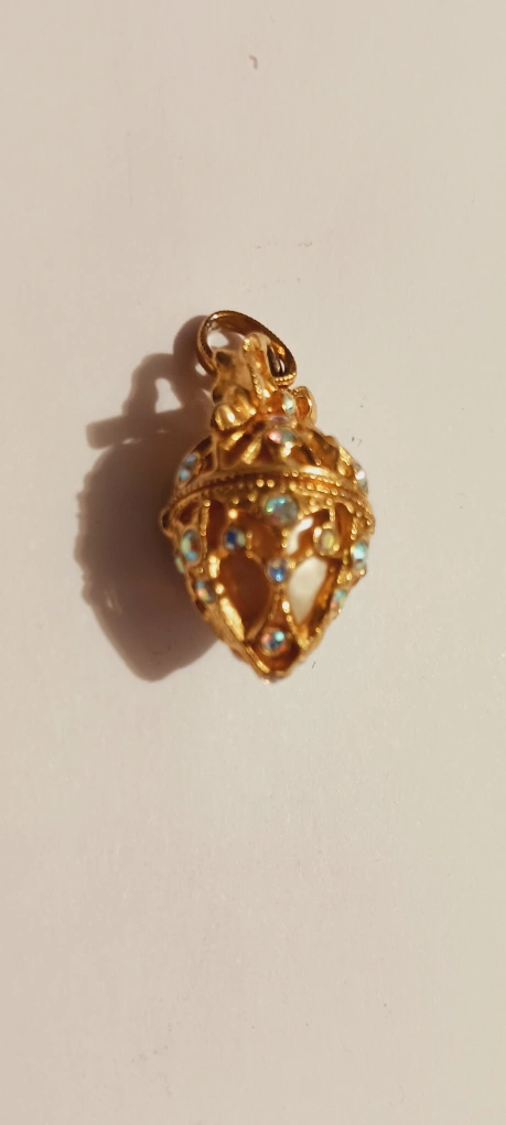 The Gold Plated Egg Pendant wulith the Certificate of Authenticity. Fabergé style lovely gold tone egg-shaped pendant charm! It's gold in color and features intricate detailing with small iridescent stones. The egg opens up to reveal a pearly interior. Perfect for adding a unique touch to any necklace or charm bracelet. This Gold Plated Egg Pendant has its Certificate of Authenticity : "This is to certify that The Golden Egg Pendant was crafted in fine porcelain hand decorated with 24 Karat Gold in an original sculptured design. It is further certified that this pendant was issued in limited edition by the Franklin Mint. Certified on March 15. 1979. "