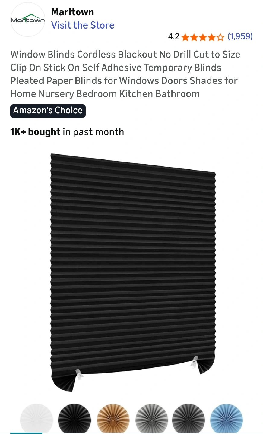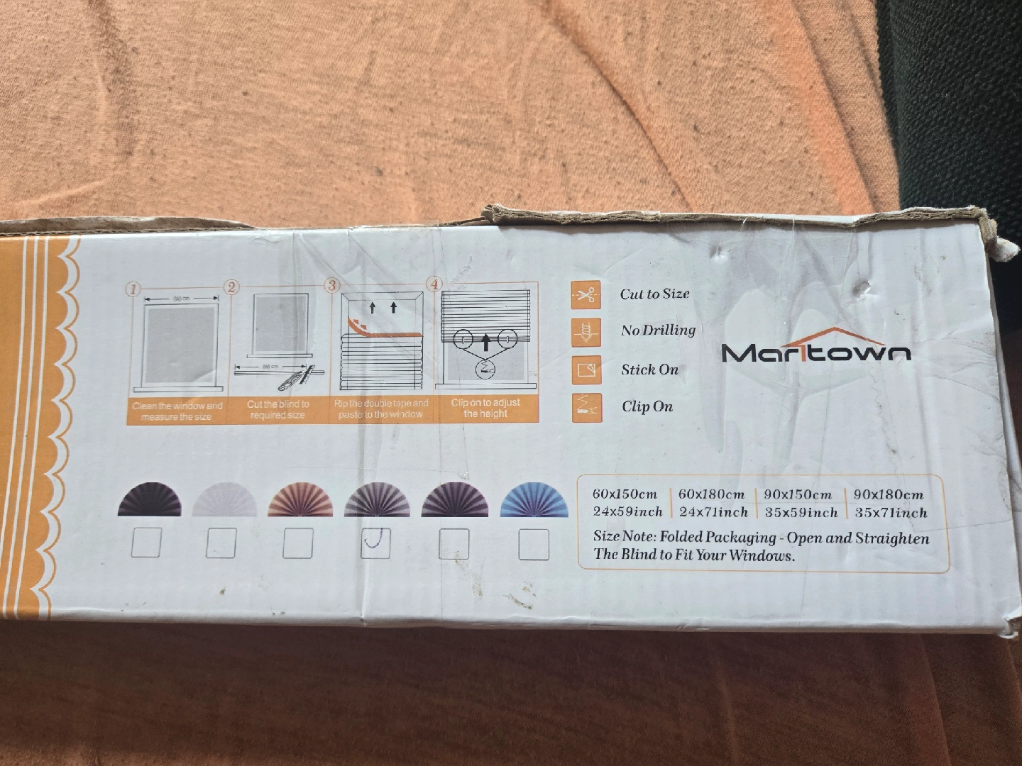 280Selling a Maritown cordless blackout pleated paper blind in black. It's a clip-on style that sticks on, so no drilling is required. It's easy to install and can be cut to size. The size is 60x150cm (24x59inch). Includes original box.