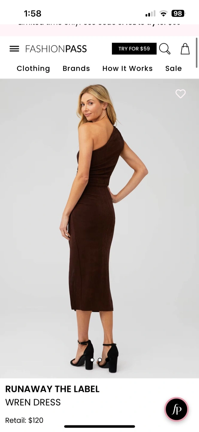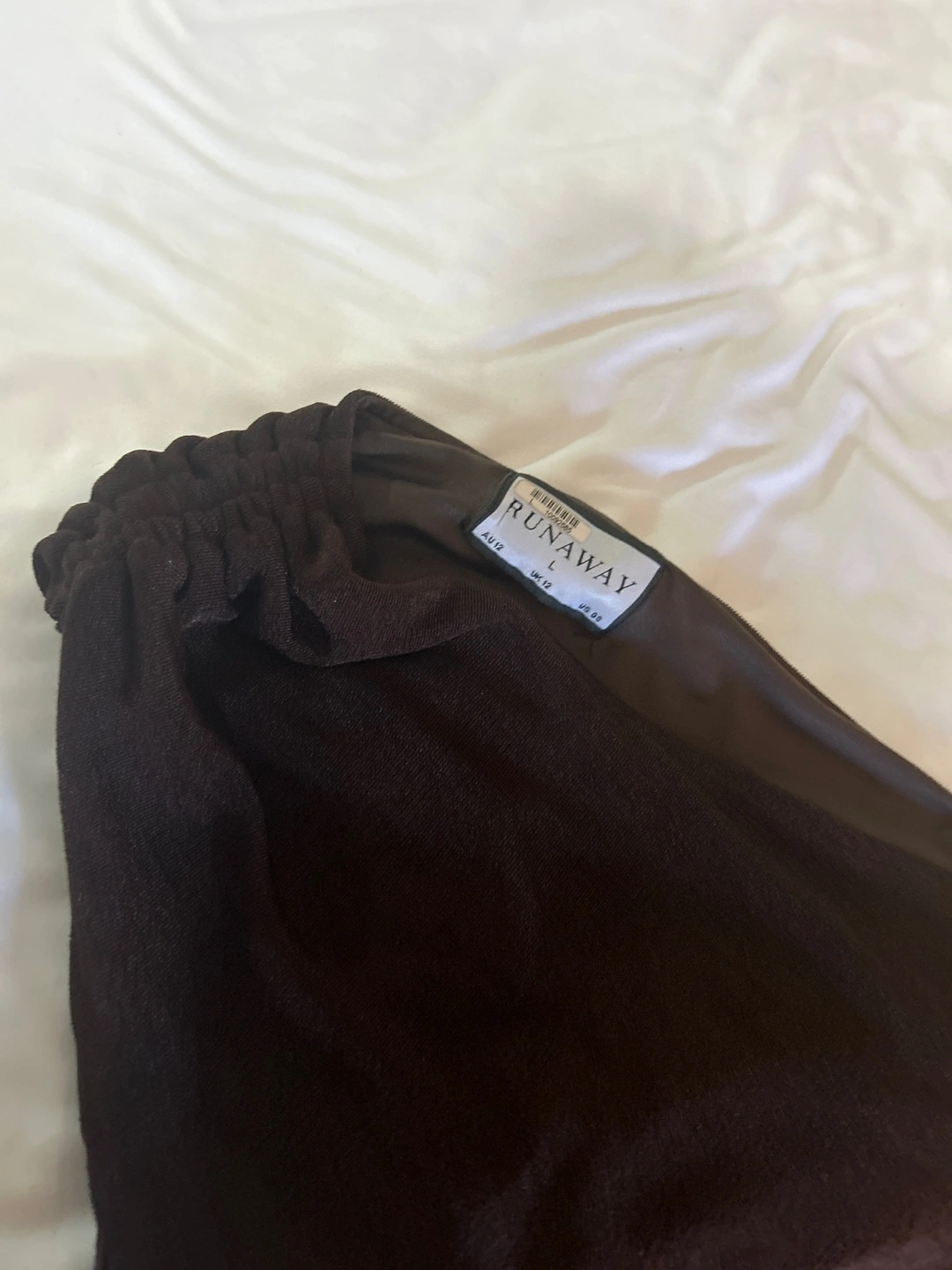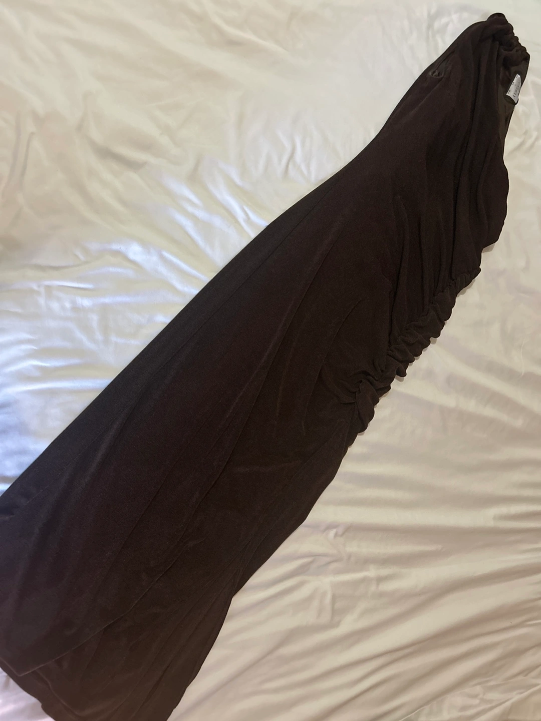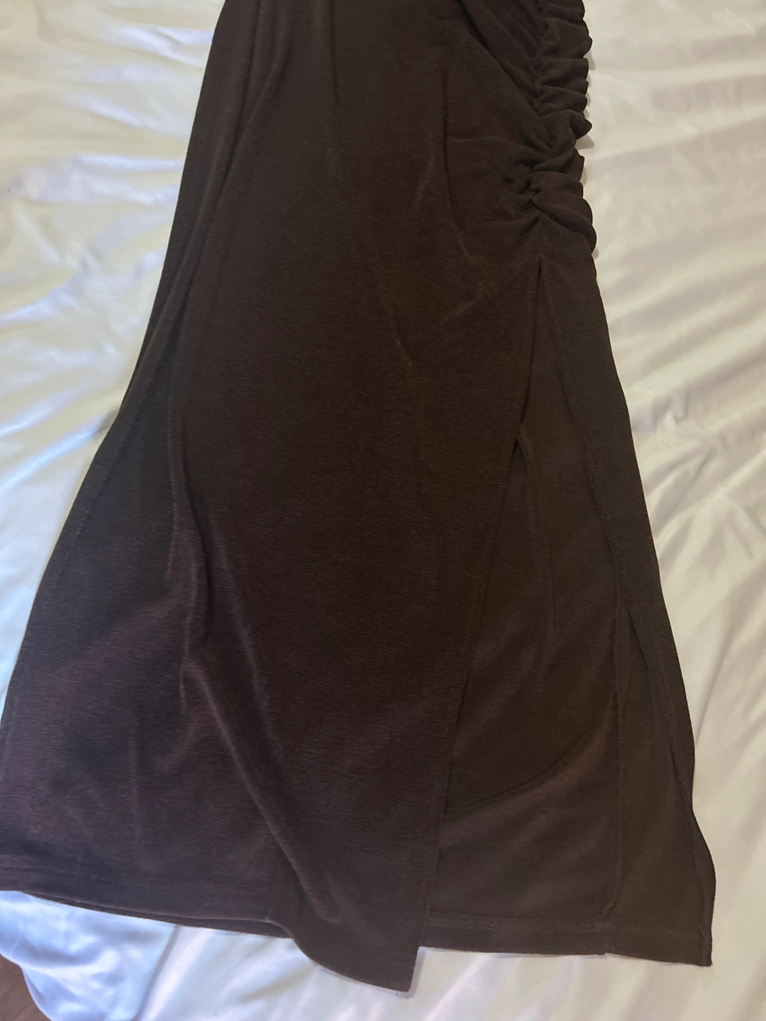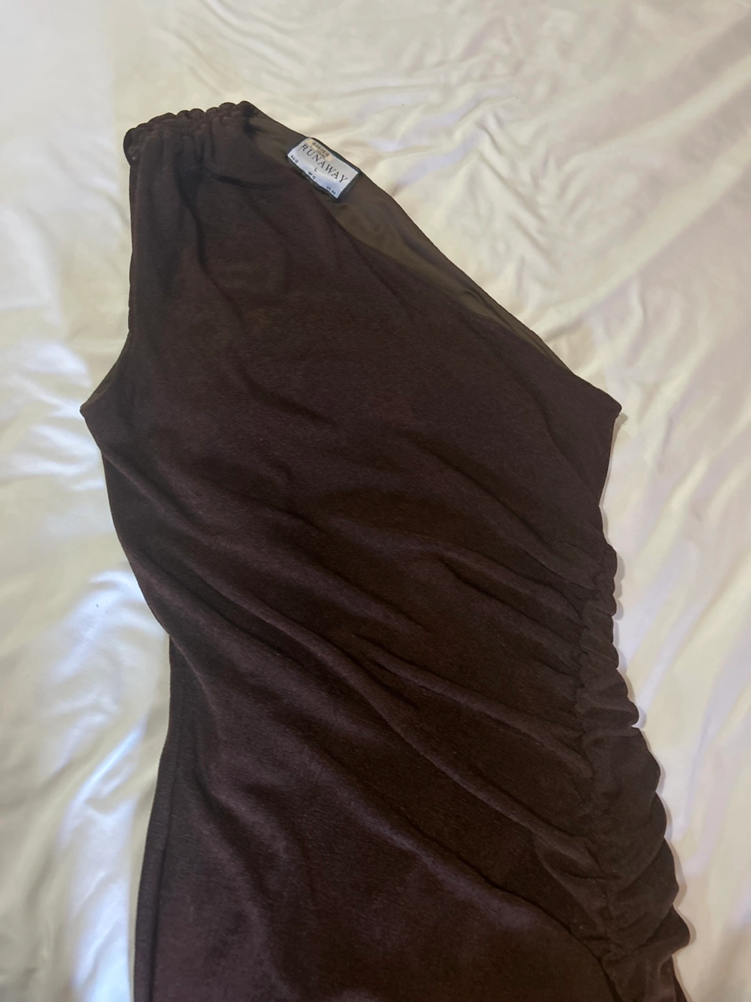 Selling a Runaway The Label Wren dress in size L. It's a beautiful brown color and features a stylish one-shoulder design with ruching detail and a slit. Originally retailed for $120!