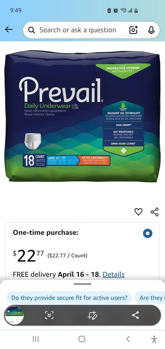 Prevail Absorbent Underwear, Pull On, Large, Disposable, extra Absorbency (Pack of 18). I have 6 of them. Let me know if you're interested!