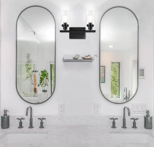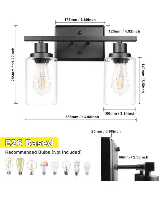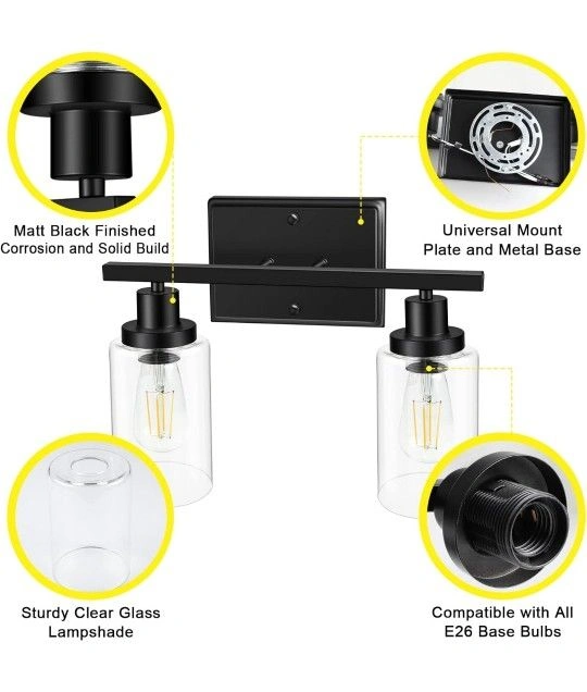 2 -Light Wall Sconces, Modern Vanity Light Fixture Black Finish, Wall Light with Clear Glass Shade for Mirror Hallway Bedroom, E26 Base Type: Wall light fixture