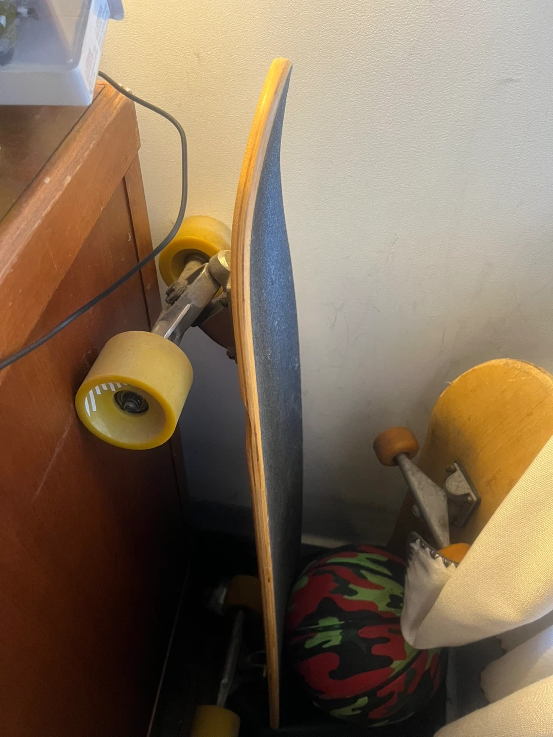 Selling a used skateboard. It has yellow wheels and shows signs of wear, as seen in the pictures